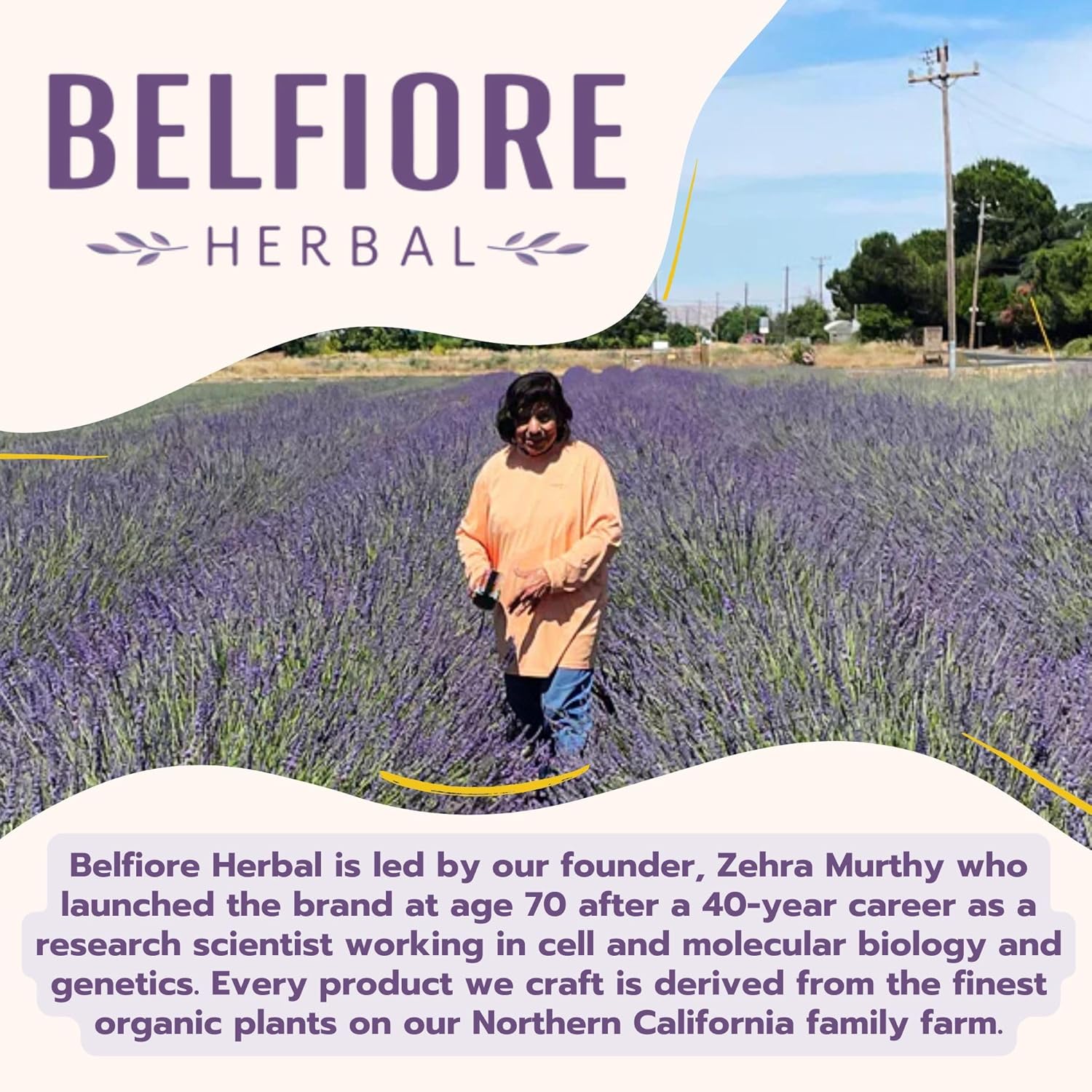 Belfiore Herbal is led by our founder, Zehra Murthy who launched the brand at age 70 after a 40-year career as a research scientist working in cell and molecular biology and genetics. Every product we craft is derived from the finest lavender grown on our Northern California family farm.
