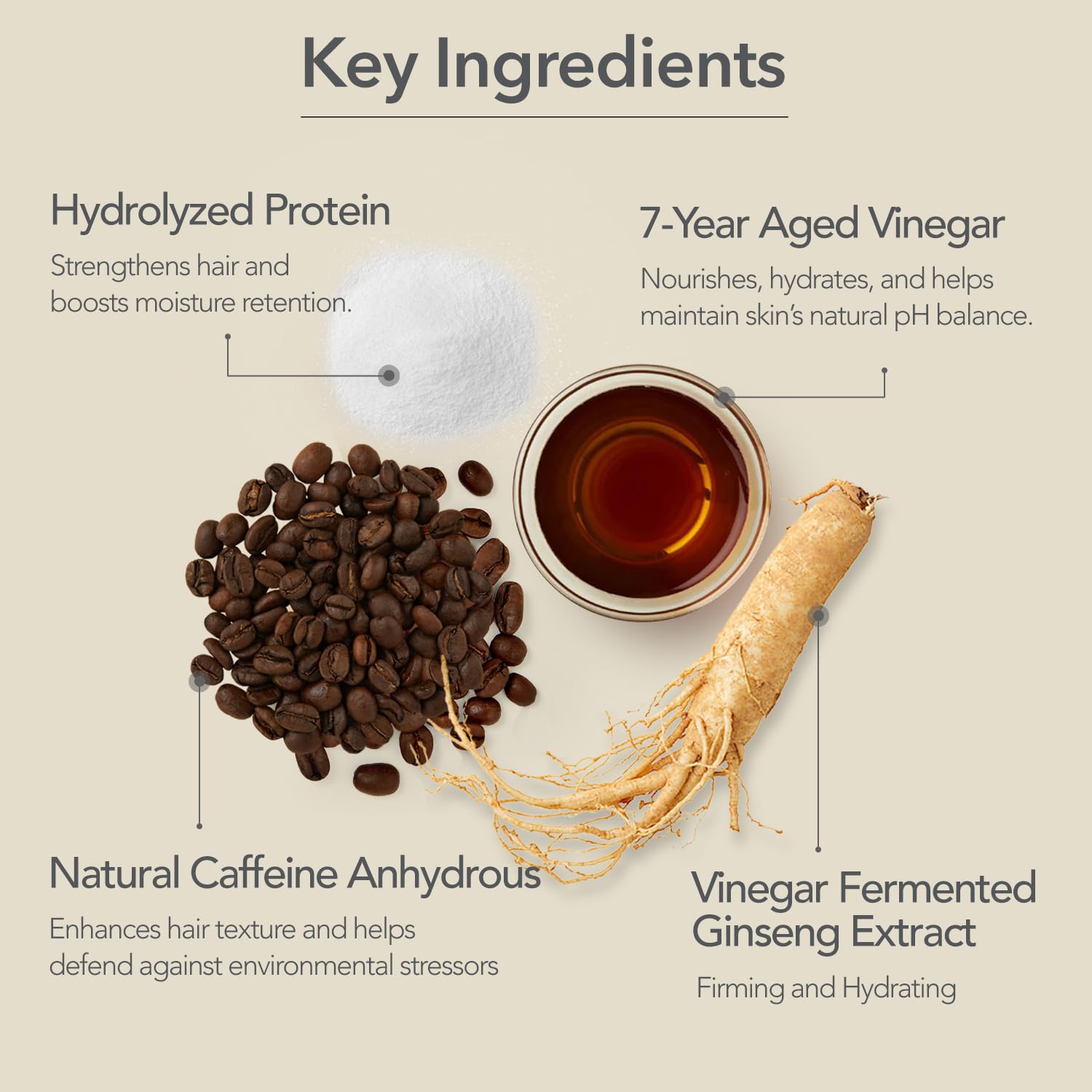 Scalp Rebalancing : Natural fermented vinegar, rich in postbiotics, amino acids, and organic acids hydrates dried hair and helps strengthen the scalp.