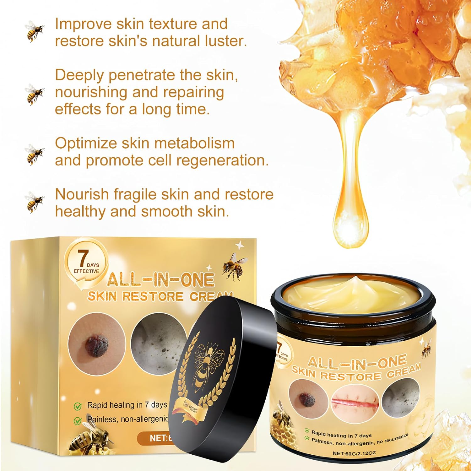 Bee Venom Skin Treatment Cream:Formulated with powerful Bee Venom, this cream helps to tighten and firm the skin, nourishing, hydrating and plumping it for healthier, fuller, more youthful-looking skin, while also improving elasticity for a firmer, more youthful-looking appearance
