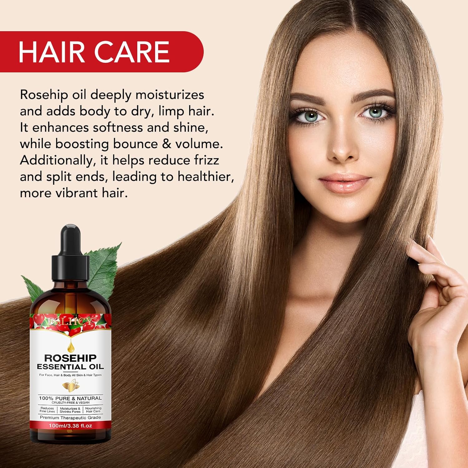 🌱【Hair Care】:Rosehip essential oil can moisturise and add body to dry, limp hair. It provides softness and shine while adding bounce and body. It also helps to reduce frizz and split ends resulting in healthier hair.