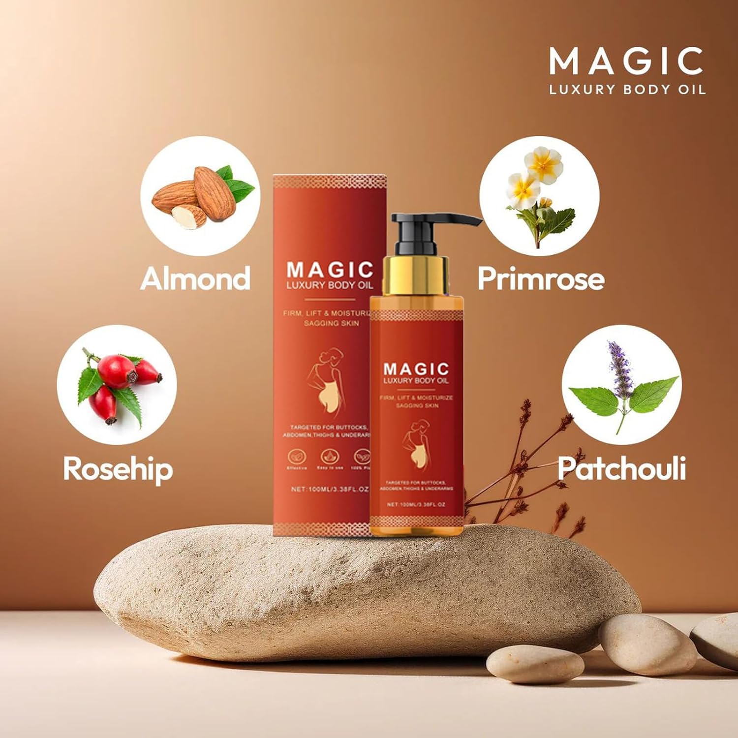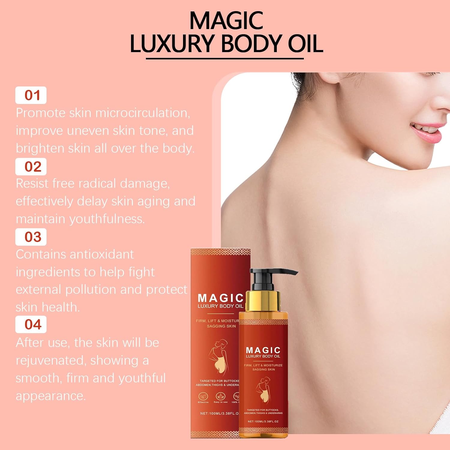 【Ma-gic Body Firming Oil】 magic body oil rich in moisturizing ingredients, it can penetrate deeply into the skin layer, provide long-lasting moisturizing and prevent dryness. help fade fine lines and wrinkles , and long-term use will make the skin glow with youthful luster.Body firming oil effectively improve skin firmness, reduce sagging, and make contours clearer.