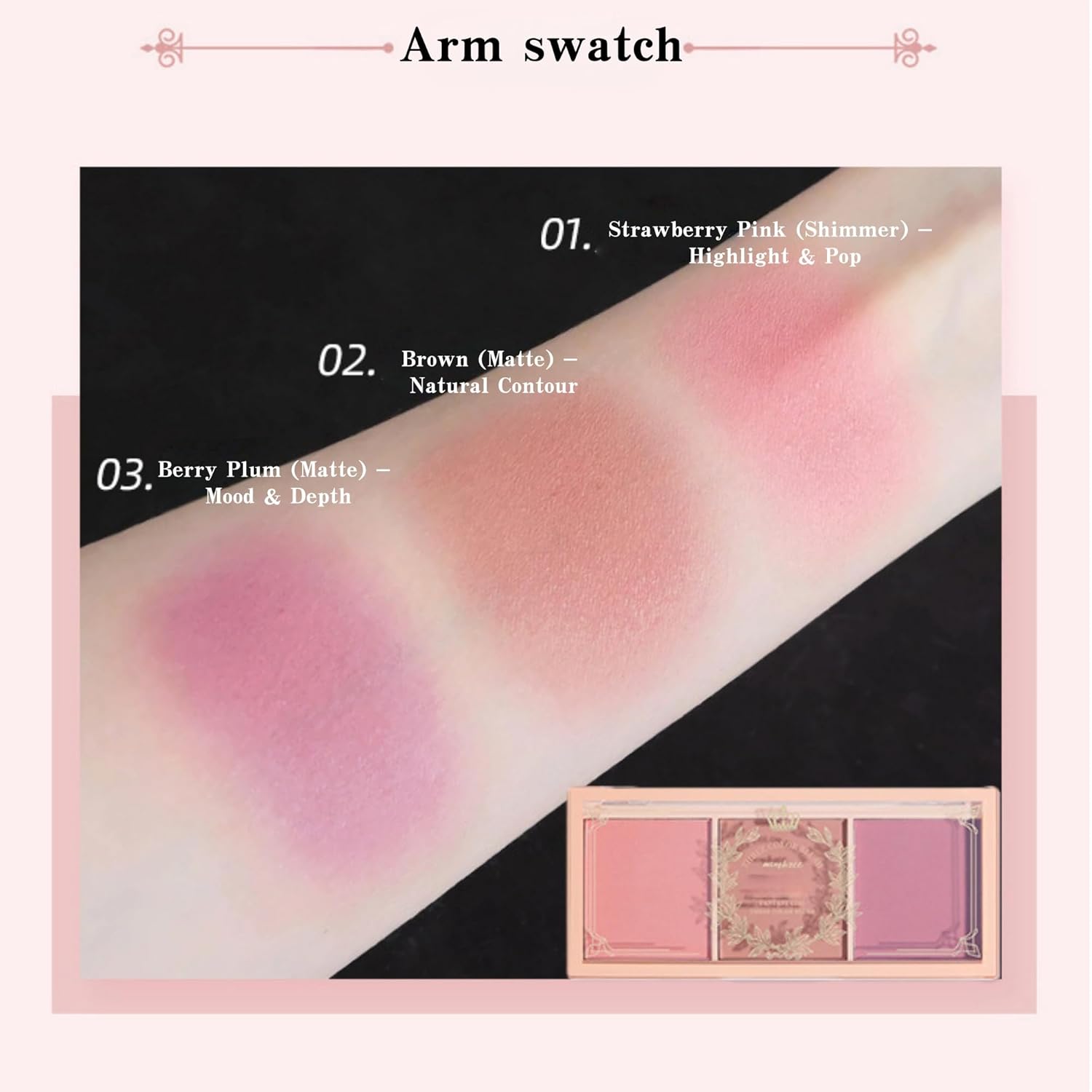Versatile 3-in-1 Color Trio: This palette features three expertly curated shades to sculpt and define your face. Includes a shimmering strawberry pink for highlighting (expansion color), a matte brown for natural contouring, and a deep berry plum for adding mood and atmosphere. Mix and match to create your custom gradient flush.