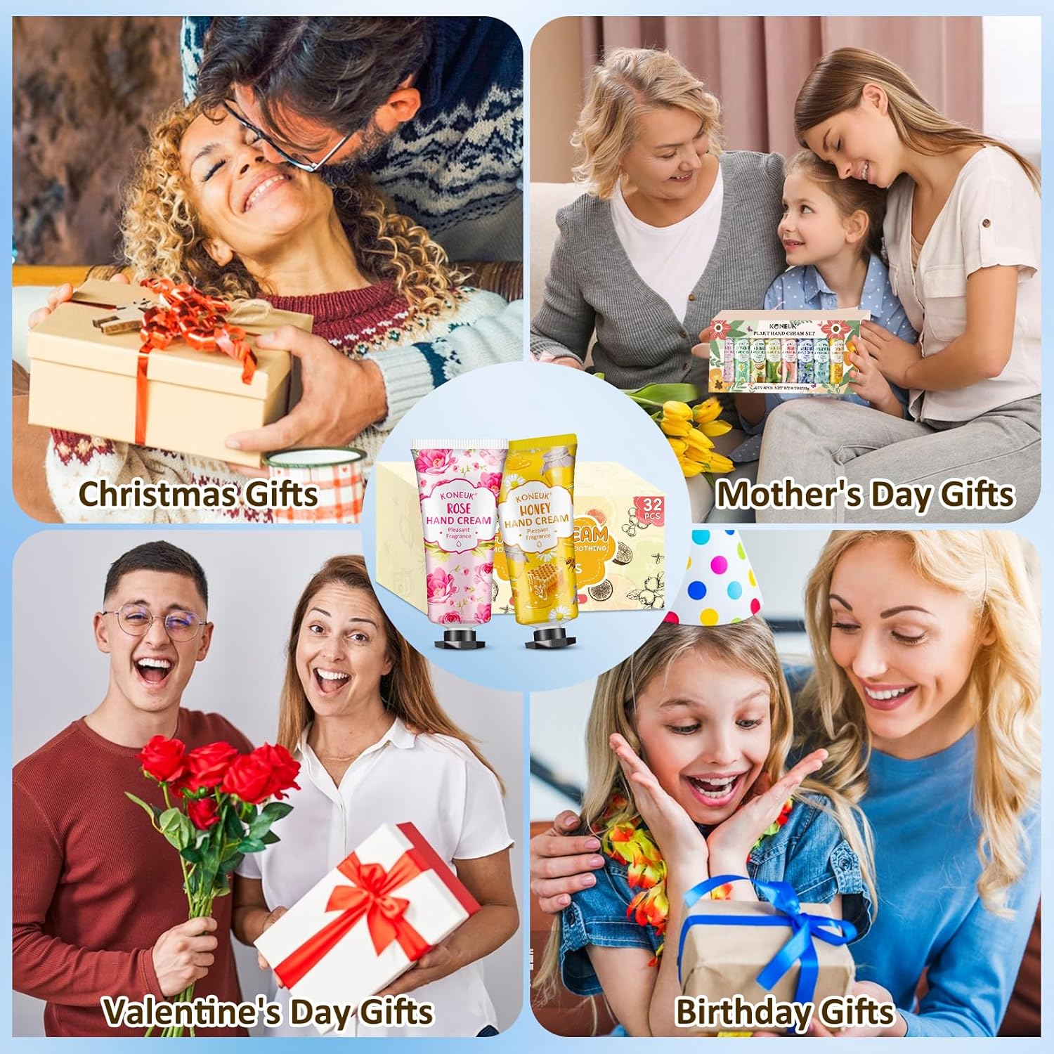 【32Pack Hand Cream Gifts Set】Rose,chamomile,coconut,avocado,peach,honey,cherry blossom,lavender,camellia,blueberry,eucalyptus,lemon,shea butter,grapefruit,green tea,aloe,16 different scents.You can choose a favorite fragrance every day to have a good mood,you can also share these mini hand lotion with friends,coworkers and family.