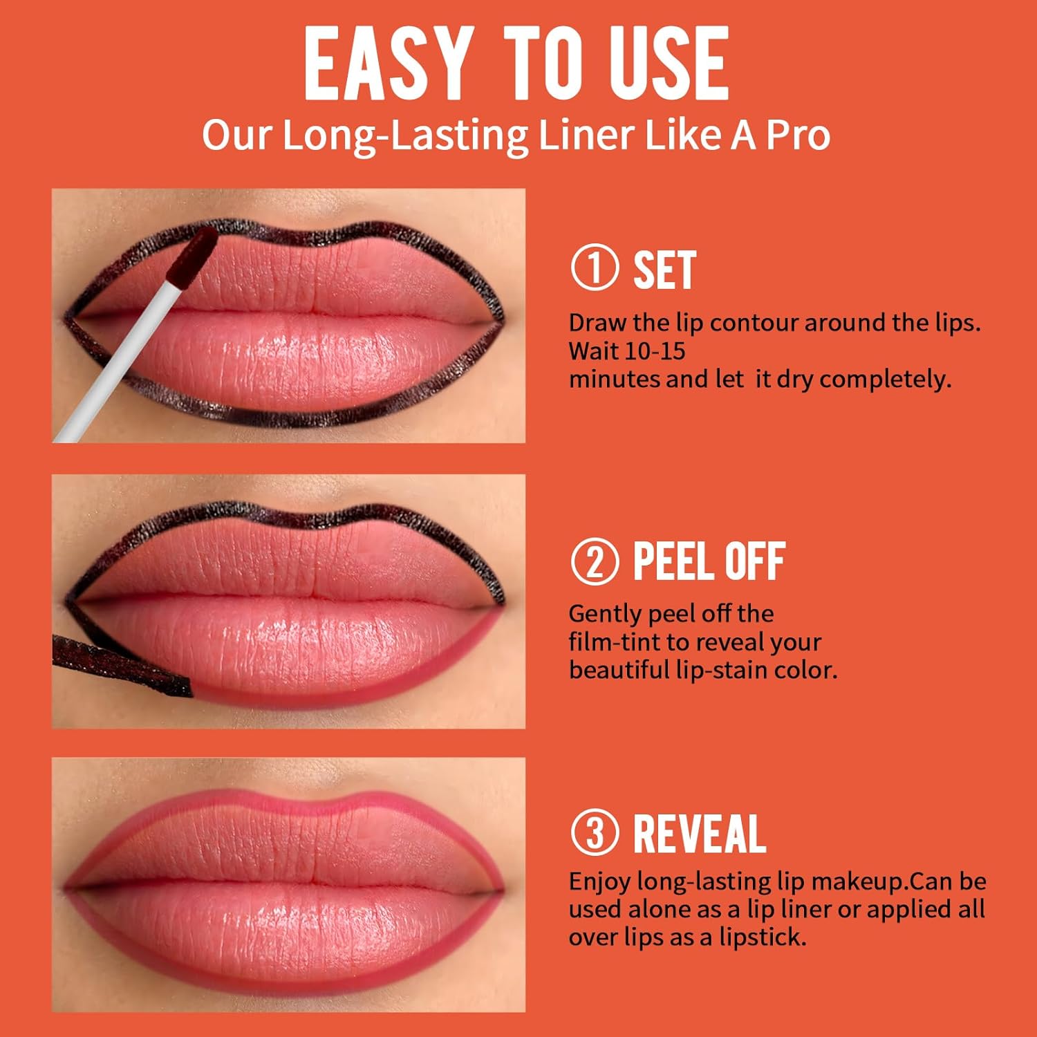 Easy to Use with Tweezers: Included The unique peel-off design allows for easy application and removal. Simply apply the lip stain, let it dry for 5-10 minutes, and then gently peel the lip liner stain off with tweezers. This method ensures a precise and long-lasting finish without the hassle of traditional lip products. Plus, the applicator is designed for smooth and even coverage
