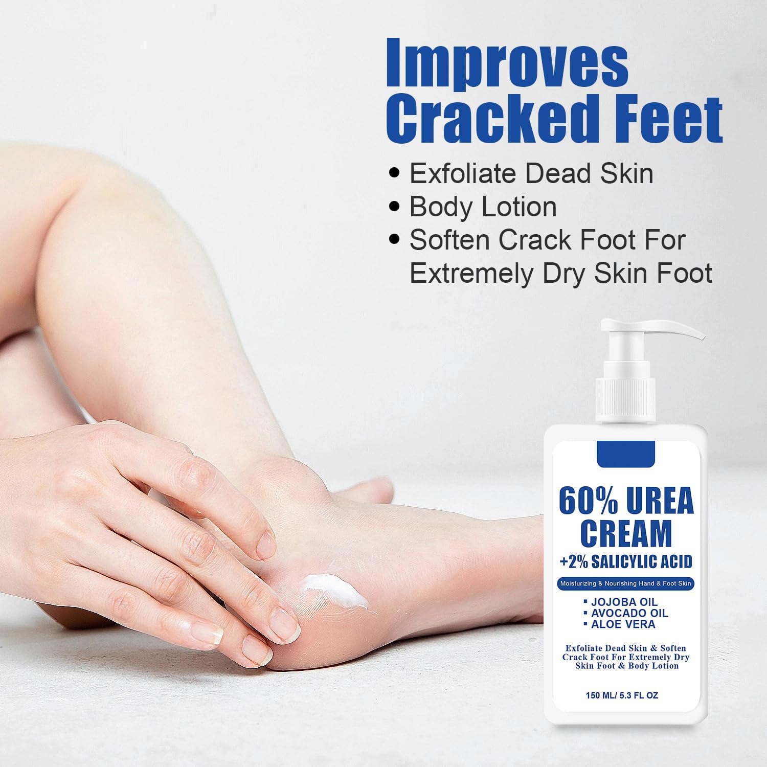 Urea and Salicylic Acid Combination: High concentration of 60% urea provides long-lasting moisturizing effect, effectively restoring extremely dry and cracked skin, softening the outer layer of skin, while reducing calluses. 2% salicylic acid helps to remove dead skin, acting as an exfoliator and smoothing skin