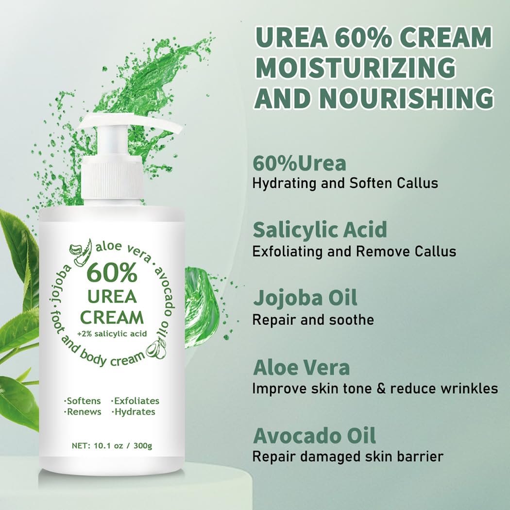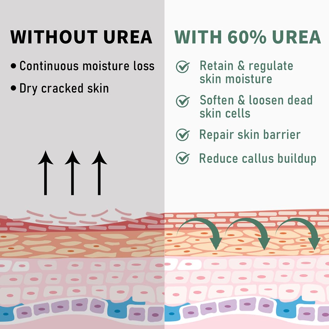 Maximum Strength 60% Urea Formula:This Fast-absorbing cream delivers deep hydration to dry, cracked skin. Enriched with 2% salicylic acid, it designs to target severe dryness, deep cracks, and stubborn calluses. Fast-absorbing for lasting relief.