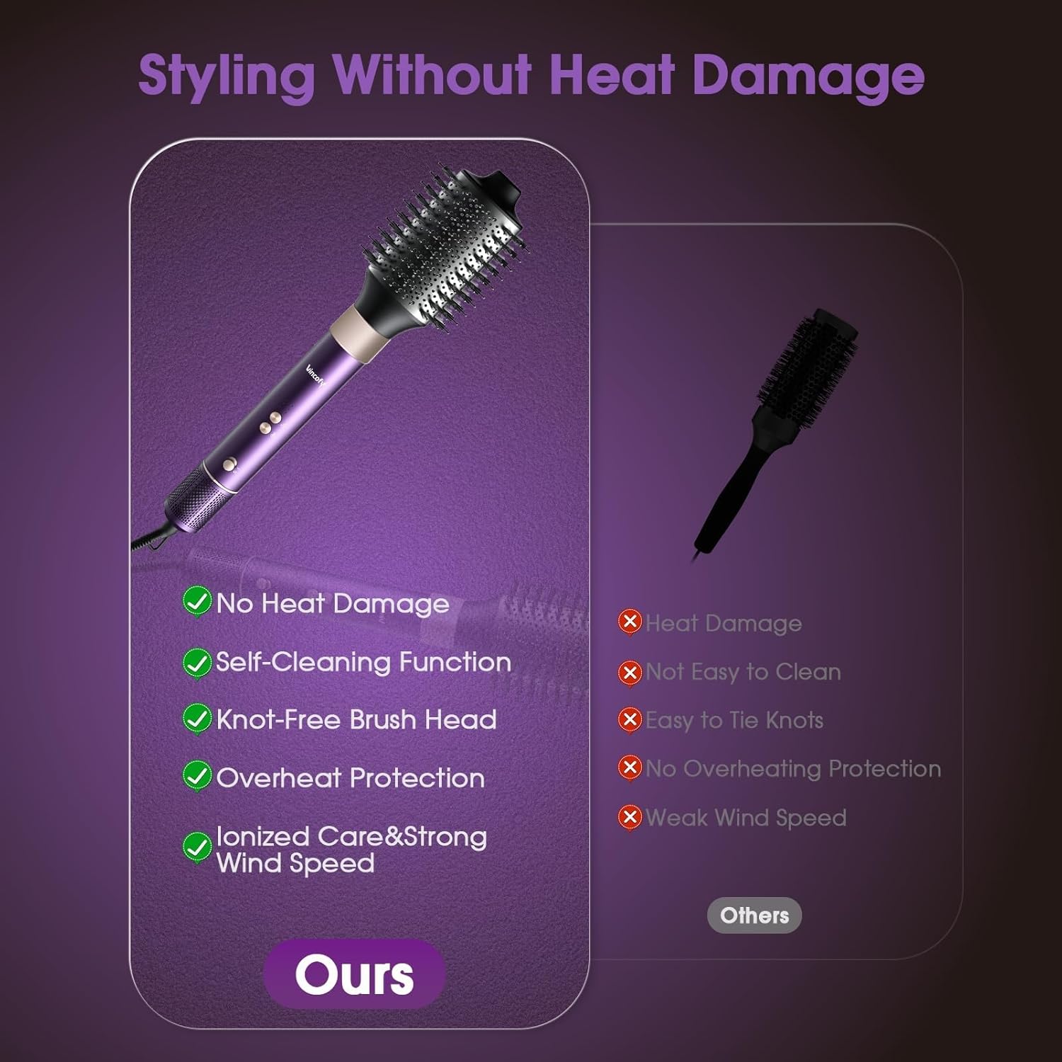 [Hair-Friendly Design] Our styling brushes designed with Tufted Bristles&Nylon Pin, it can effectively prevents hair tangles, fluffs the hair roots and leaving your hair smooth and shiny. In addition, our styling brush can be detached and cleaned, it has self-cleaning function, which activates the self-cleaning mode, and the reverse air flow will blow out the dust and hair hidden in the handle, so as to avoid the accumulation of hair after long-term use and reduce the use effect of the brush.