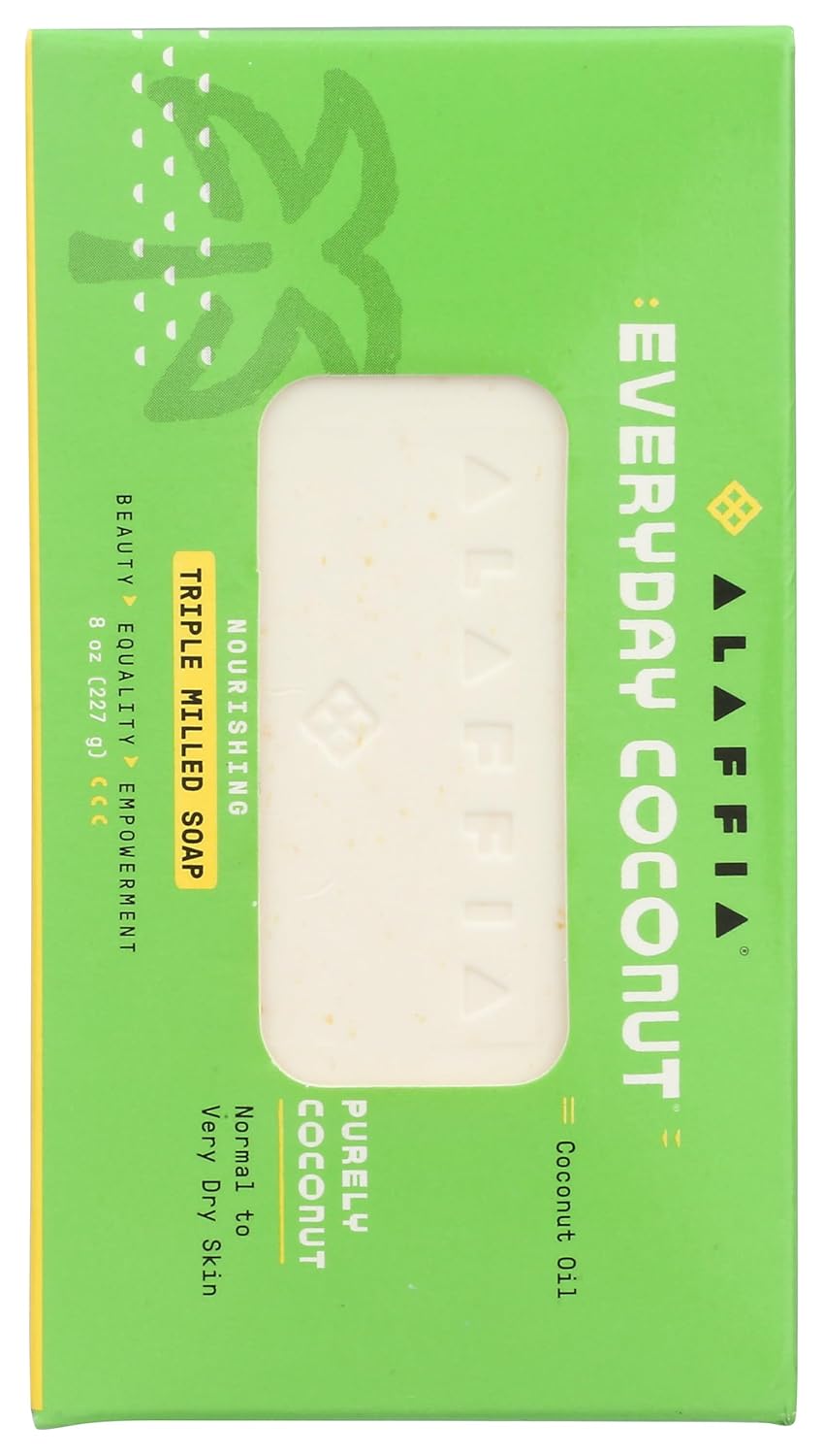 Alaffia Everyday Coconut Bar Soap, 8 oz, is designed for daily full-body cleansing with a straightforward, plant-based formula. Featuring coconut oil as a primary ingredient, it creates a rich, consistent lather that rinses clean without heavy residue. The solid 8-ounce (227 g) bar is free from artificial colorants and synthetic fragrances, offering a clear, uncomplicated approach to personal care. Packaged in recyclable paper wrap, it is easy to store in bathroom cabinets or travel kits while maintaining its shape and integrity between uses.