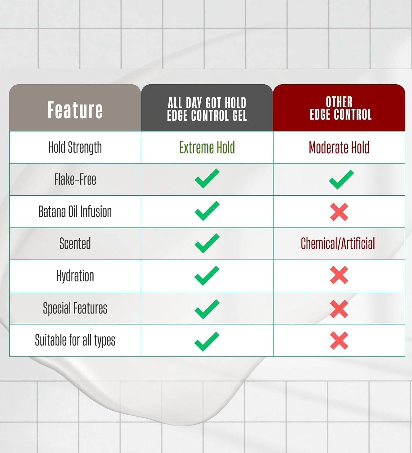 𝗘𝗫𝗧𝗥𝗘𝗠𝗘 𝗛𝗢𝗟𝗗 𝗙𝗢𝗥 𝗘𝗗𝗚𝗘𝗦 – Includes 1x 2.02 fl oz Edge Control Gel with Batana Oil by All Day Got Hold. Delivers strong, flexible hold to keep edges neat and styles defined without flaking or stiffness.