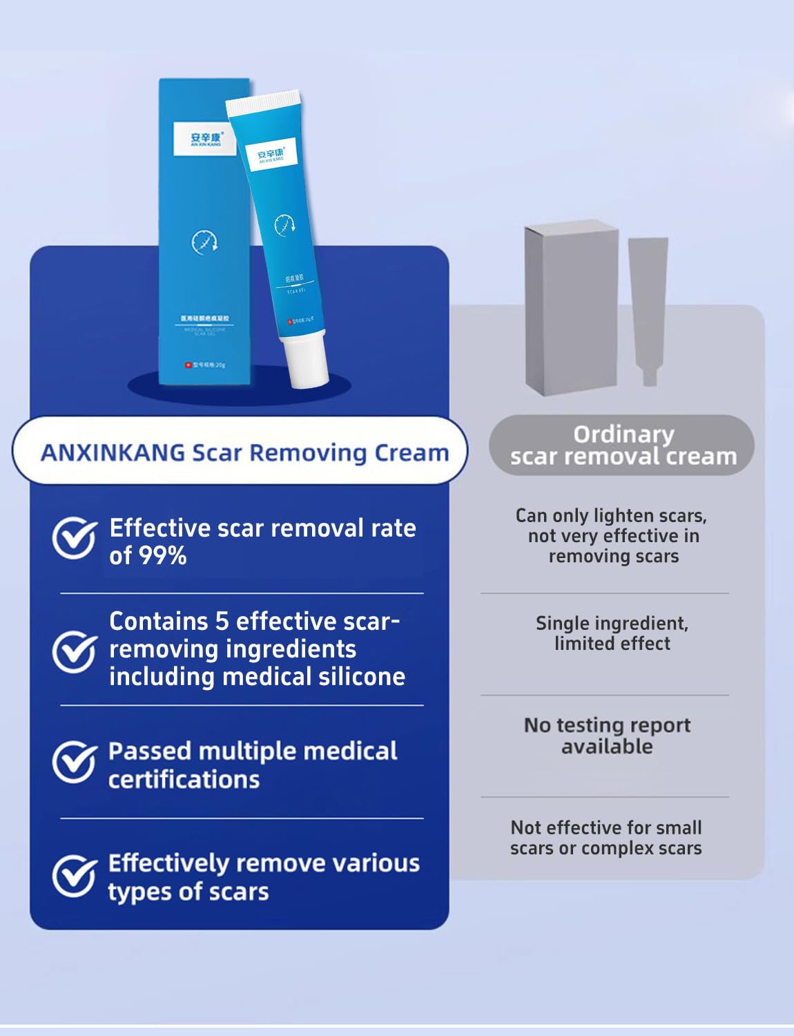 Visible Results Within 5 Weeks: This scar treatment is effective for both newly healed wounds and visible old scars. With continuous use, scars that have existed for many years will become less obvious and closer to the natural texture and color of the skin