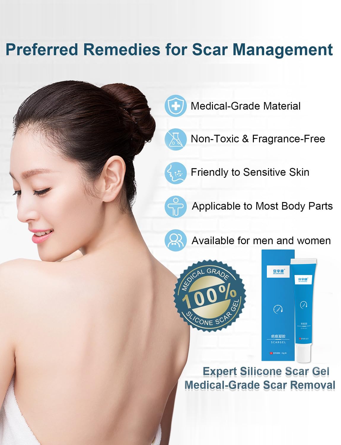 SAFE AND EFFECTIVE MATERIALS Medical grade materials For all types of scars Non-toxic and cruelty-free Both adults and children can be used Friendly to sensitive skin