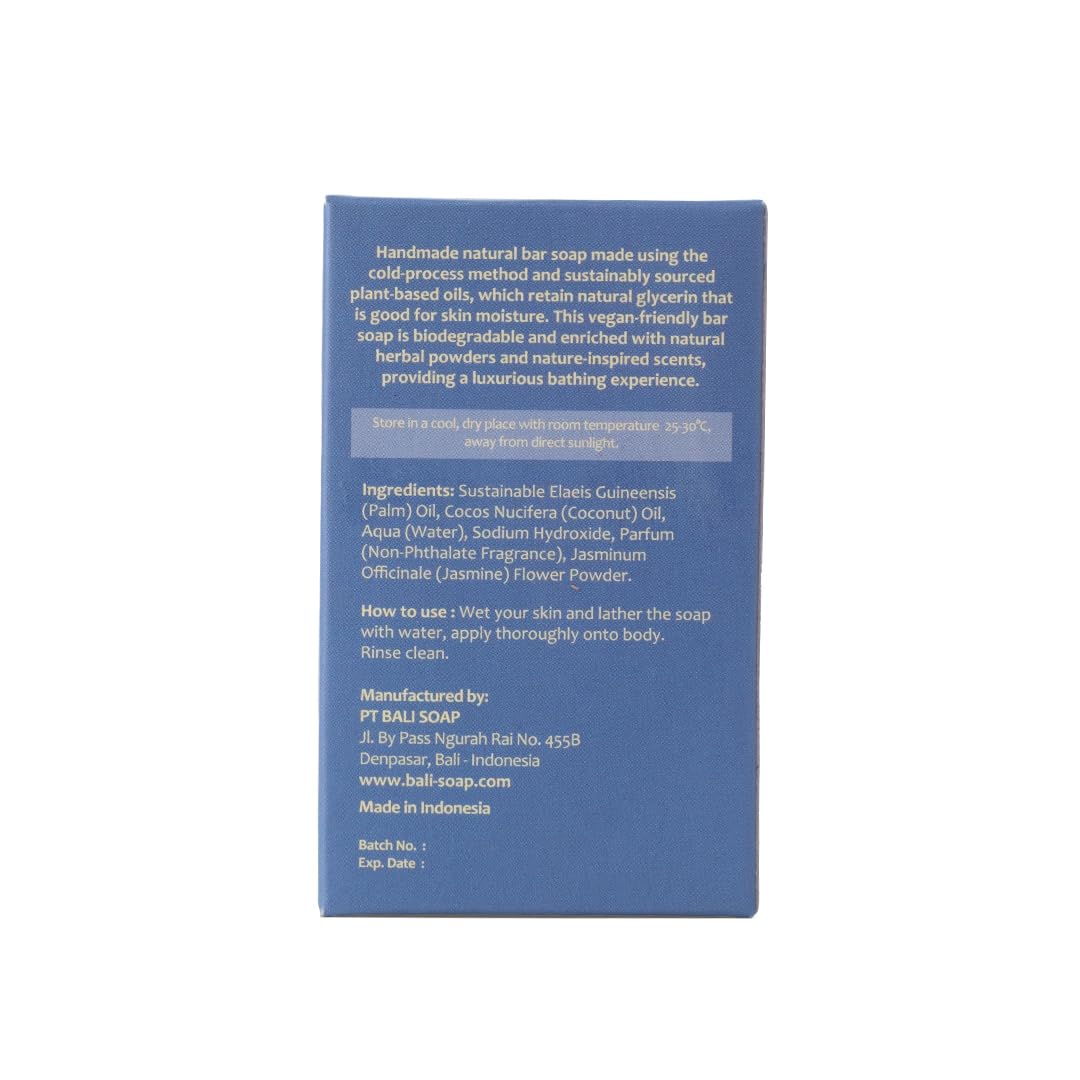 NATURAL SOAP: Naturally exotic soap from Bali! Crafted in a cold process method using plant-based ingredients and textured with botanicals from the Indonesian archipelago. Bali Soap natural glycerin bars gently exfoliate and moisturize the skin with ultra-nourishing lather, rinsing off clean without residue and leaving only the delicate floral scent of Jasmine.