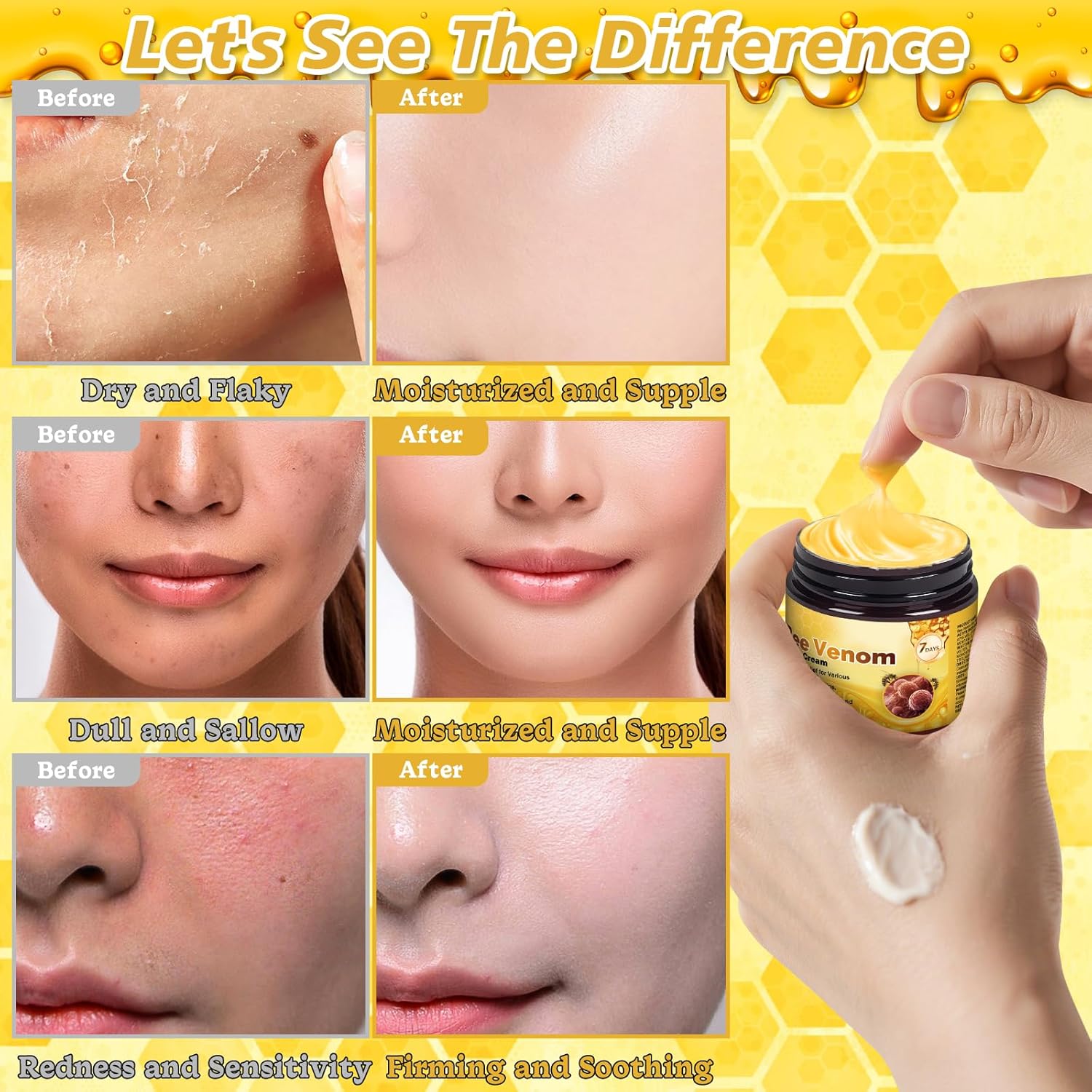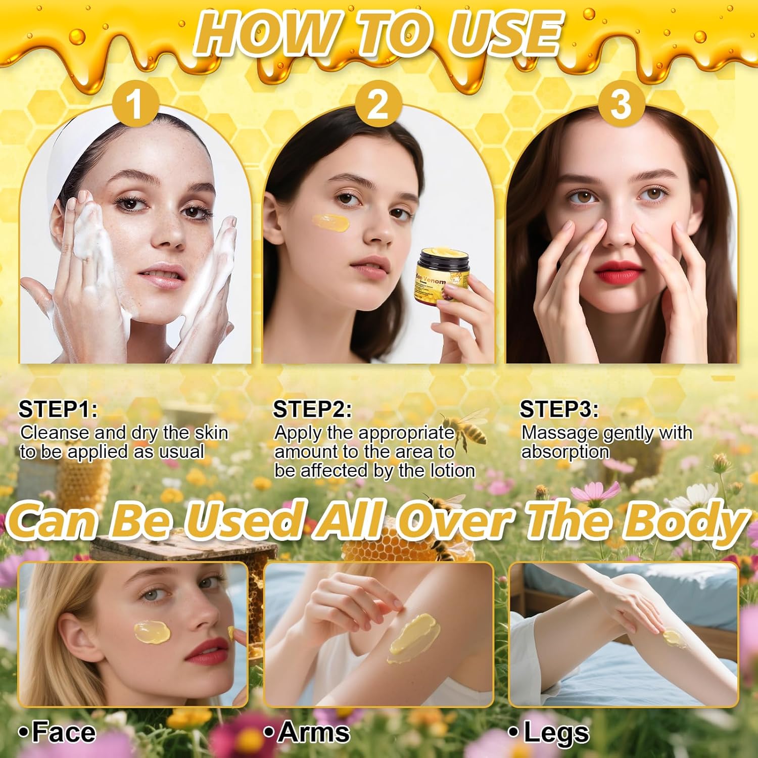 ✅【Professional Bee Venom Cream】This bee venom cream is specially designed to lift, firm, and revitalize the skin while reducing the appearance of fine lines and wrinkles. Our advanced formula contains bee venom essence to tighten sagging skin and restore a youthful glow.