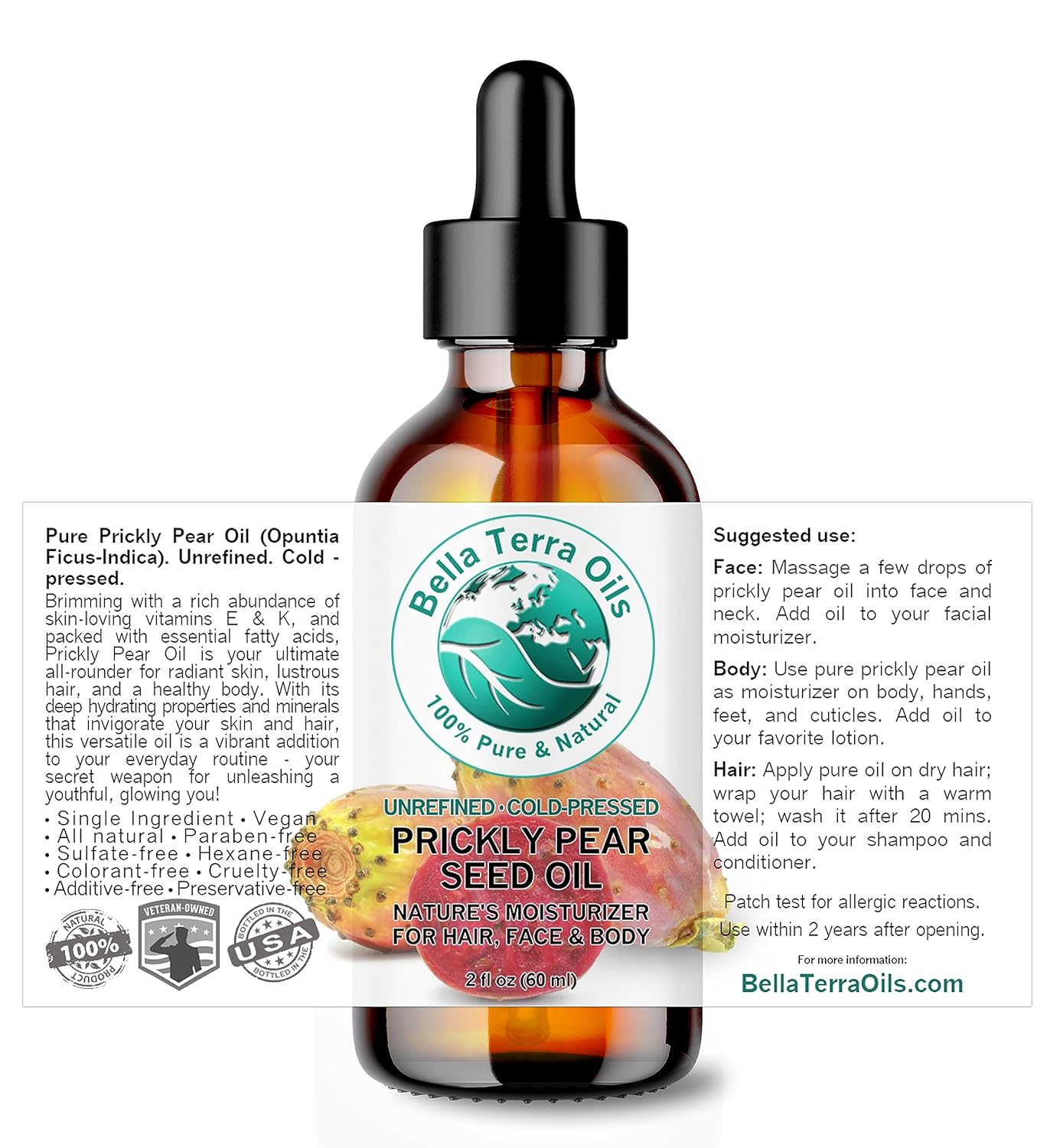 Bella Terra Oils – Prickly Pear Seed Oil 2 oz – Cold-Pressed Excellence, Packed with Vitamin E, Linoleic Acid, and Betalains, A Luxurious Touch for the Face