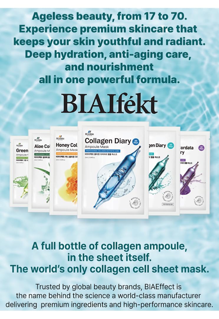 The NEXT GENERATION SHEET beyond hydrogel : Unique material of COLLAGEN GAUZE CELL sheet exclusively produced by BIAIfekt . So popular Korean K-BEAUTY facial masks, Sheet itself infused with whole bottle of collagen ampoule , so you can see stretched collagen from the sheet. So many immediate effects have been proven by the clinical test.