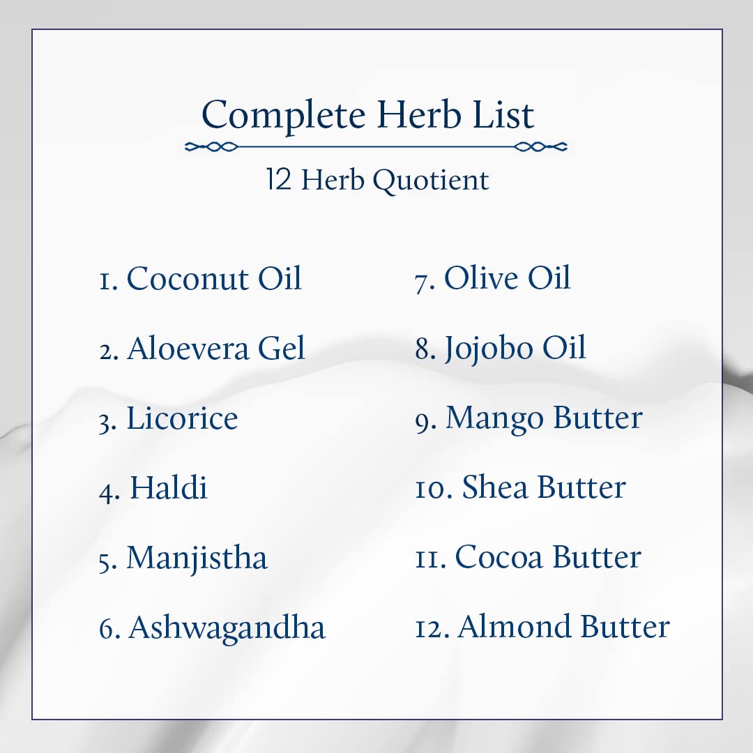 Contains 12 Ayurvedic herbs like Aloevera, Turmeric, Ashwagandha, Olive Oil. Also contains Mango butter, Shea Butter, Almond Butter and Cocoa Butter. Free from Sulphate, Paraben and other harmful chemicals