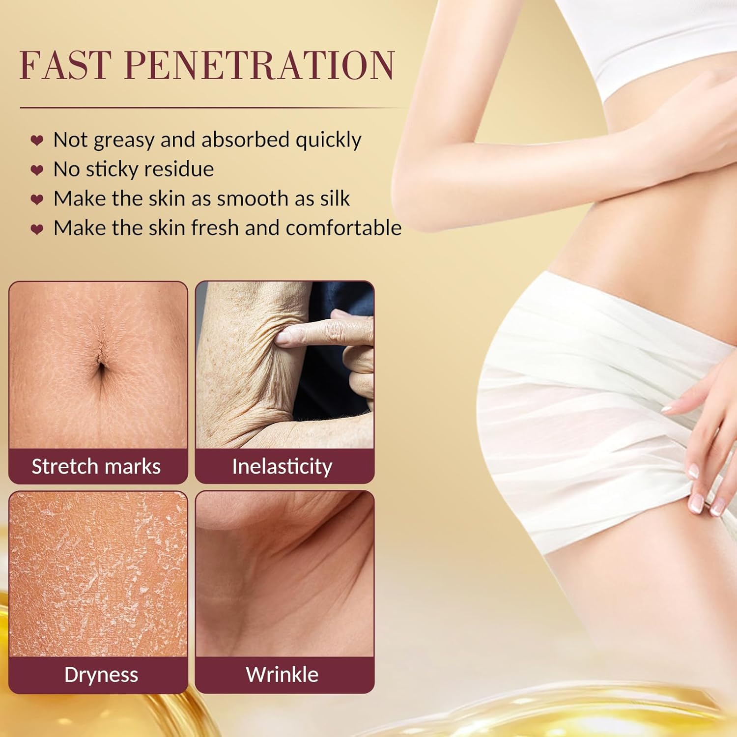 【Deep Nourishment-Easy To Absorb】— Gentle and non-irritating body oil is suitable for all skin types. Ideal for use on the abdomen, hips, thighs, and arms, it integrates easily into daily, post-shower, bedtime, or spa routines. Gentle enough for dry, oily, combination, and sensitive skin, making it a versatile daily choice.. With continued use for approximately 3 weeks, you will experience significant results.