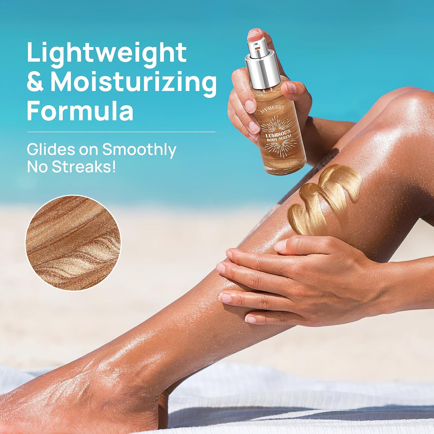 ✨ RADIANT GLOW ALL DAY: MYMERRY body shimmer oil achieving a sun-kissed radiance anytime. This lightweight formula delivers a soft shimmer under natural light, enhancing your skin’s beauty. With continued use, it helps brighten and even out skin tone for a more luminous, healthy look.