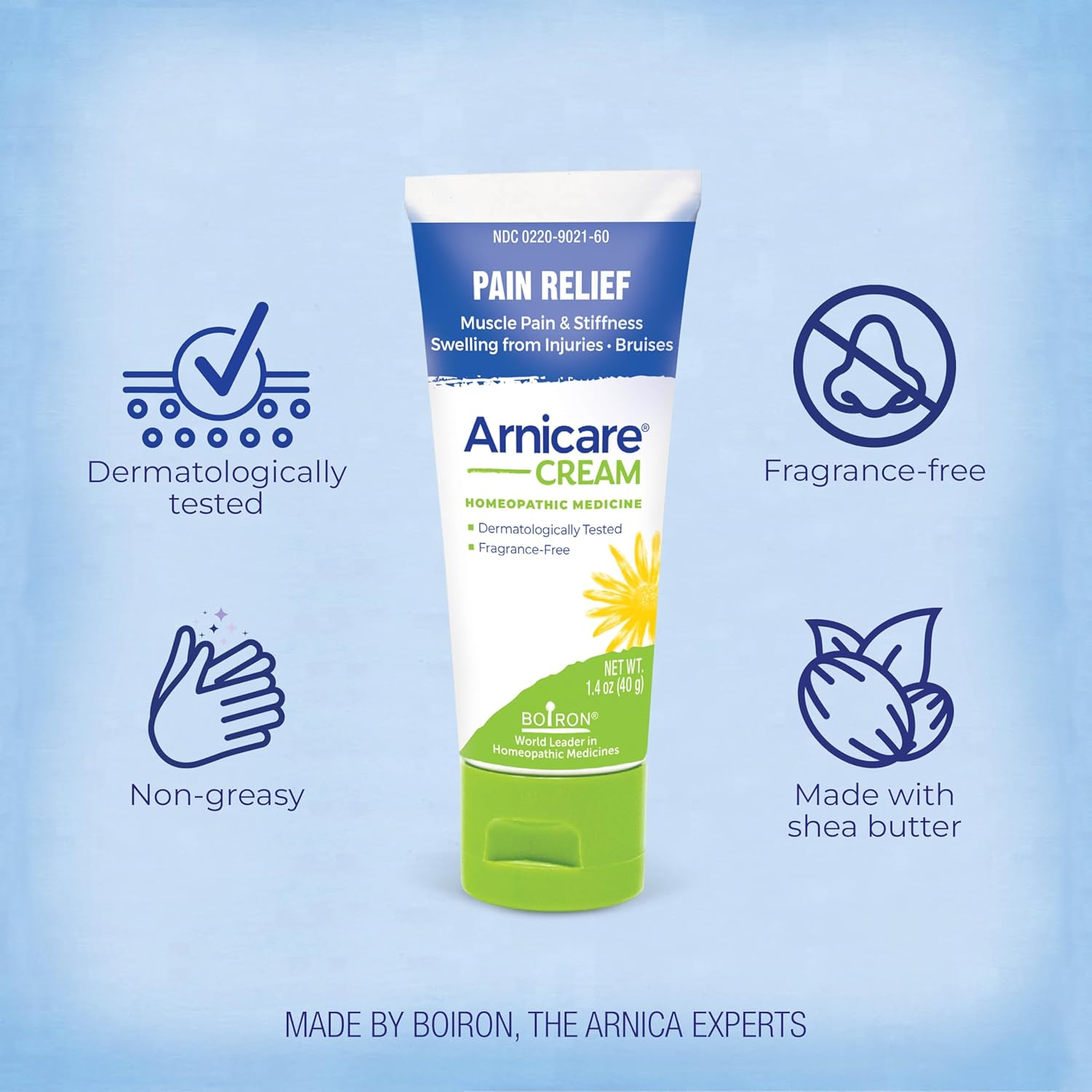 Before pain gets in your way, treat it naturally at the first sign with Arnicare and feel better faster. Arnicare helps to relieve muscle pain and stiffness and to reduce pain, swelling, and discoloration from bruises. Arnicare Cream has a soothing effect and is preferred for use on sensitive skin. This non-sticky, non-greasy cream is great for massaging sore muscled. Arnicare Cream works best when applied at the first sign of pain.