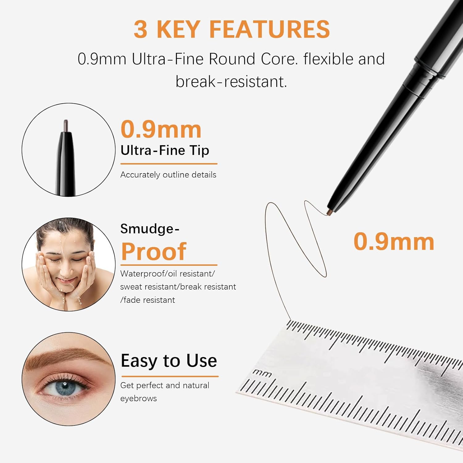 0.9mm Ultra-Fine Mechanical Pencil: The ultra slim 0.9mm defining eye brow pencil tip effortlessly draws on hair-like strokes,Fills in Sparse Areas and Gaps,Built-in eyebrow spoolie brush creates precisely defined brows.(Includes one same-color refill in the package, for long-lasting and convenient use.)