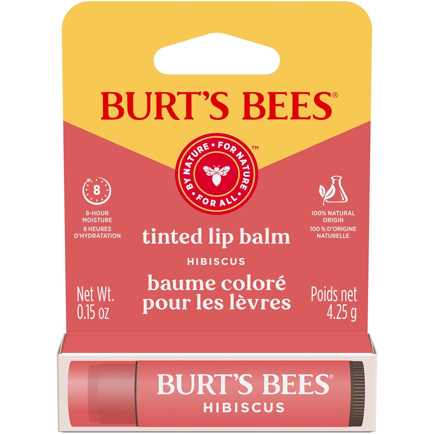 TINTED LIP BALM: One 0.15 oz. lip balm tube of Burt’s Bees Hibiscus Tinted Lip Balm that moisturizes chapped lips and adds a hint of color with every swipe