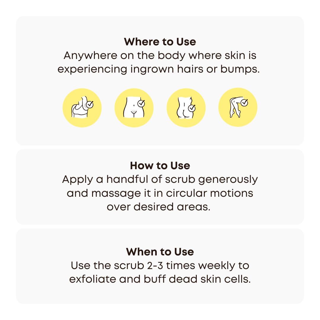 How to Use: The scrub is best used in the shower with wet skin. Once you are done cleaning your body, take a small handful of scrub and rub it on your skin in a circular motion. You can use the exfoliating scrub all over your body. Put extra focus on the bikini line, legs, underarms, and tush. For External Use Only.