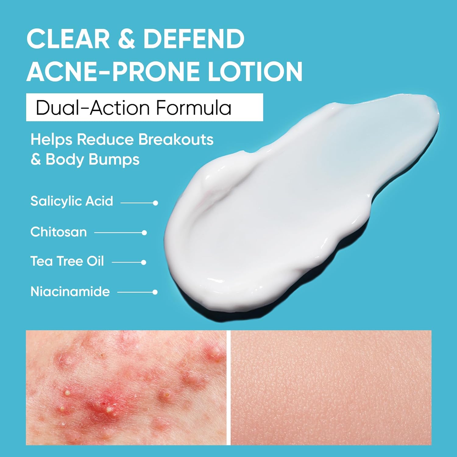 Dual-Action Formula – Clears Acne & Prevents Recurrence: Formulated with 2% Salicylic Acid, Niacinamide, Chitosan, and Tea Tree Oil, this body acne lotion targets breakouts at the root. It clears clogged pores, reduces redness, and helps prevent future flare-ups—ideal for mild to moderate acne, butt bumps, and oily, acne-prone skin.