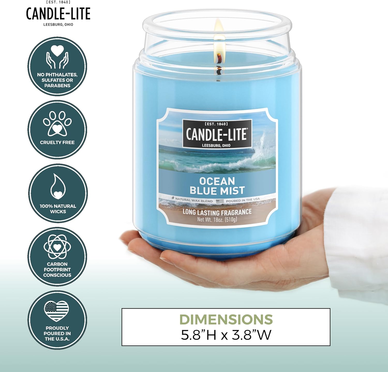 Candle-lite is America’s #1 candle.Bring that fresh ocean mist scent into your home with this Ocean Blue Mist scented candle.This refreshing scent offers the feeling of windswept shores with a hint of beach grass, wild blossoms, and a cool evening mist.Measuring 5.8″Hx 3.89″D, this Candle-lite candleis the perfect size to place in any room. Enjoy a calming glow no matter where you are with this 18 oz. large candle. This single wick candlehas a 100% cotton wick, is lead free, and burns up to 110 hours. The light blue colored paraffin wax candle maintains a consistent burn. Always remember to candle with care and burn within sight. Keep candles away from children, pets, and things that can catch fire. Stop use when .5” of unmelted wax remains and extinguish every 4 hours for cooling. Trim the candle wick to .25” prior to each use. Lighting America’s hearts and homes since 1840, Candle-lite Company has been crafting quality candles in Ohio’s heartland for over 180 years. Create an inviting atmosphere with these candles for home scented with varied fragrances suitable for all the different rooms.