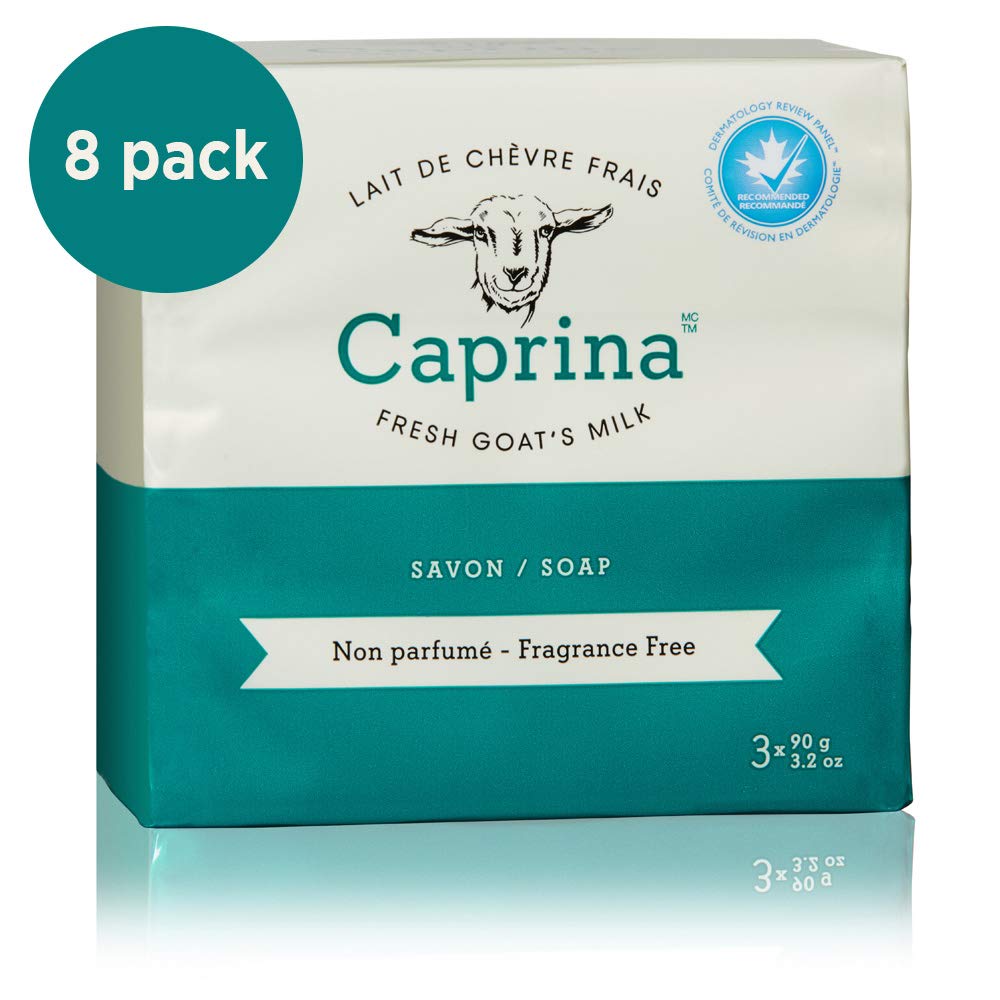 Contains: (8) 3 Packs of 3.2 oz (24 Soap Bars) Caprina Fresh Goat’s Milk Soap Bars, Fragrance Free