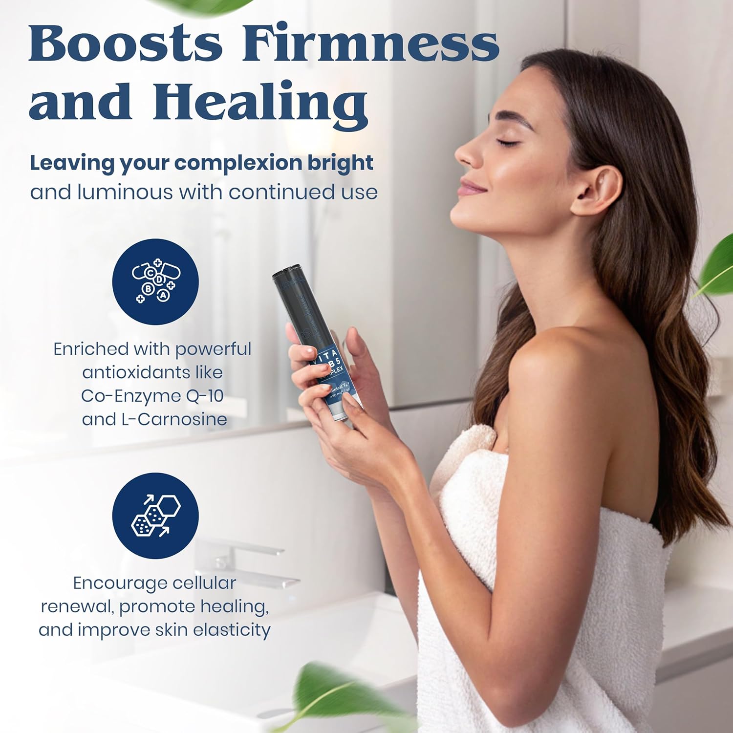 𝗕𝗢𝗢𝗦𝗧𝗦 𝗙𝗜𝗥𝗠𝗡𝗘𝗦𝗦 & 𝗛𝗘𝗔𝗟𝗜𝗡𝗚 – Enriched with powerful antioxidants like Co-Enzyme Q-10 and L-Carnosine to encourage cellular renewal, promote healing, and improve skin elasticity.