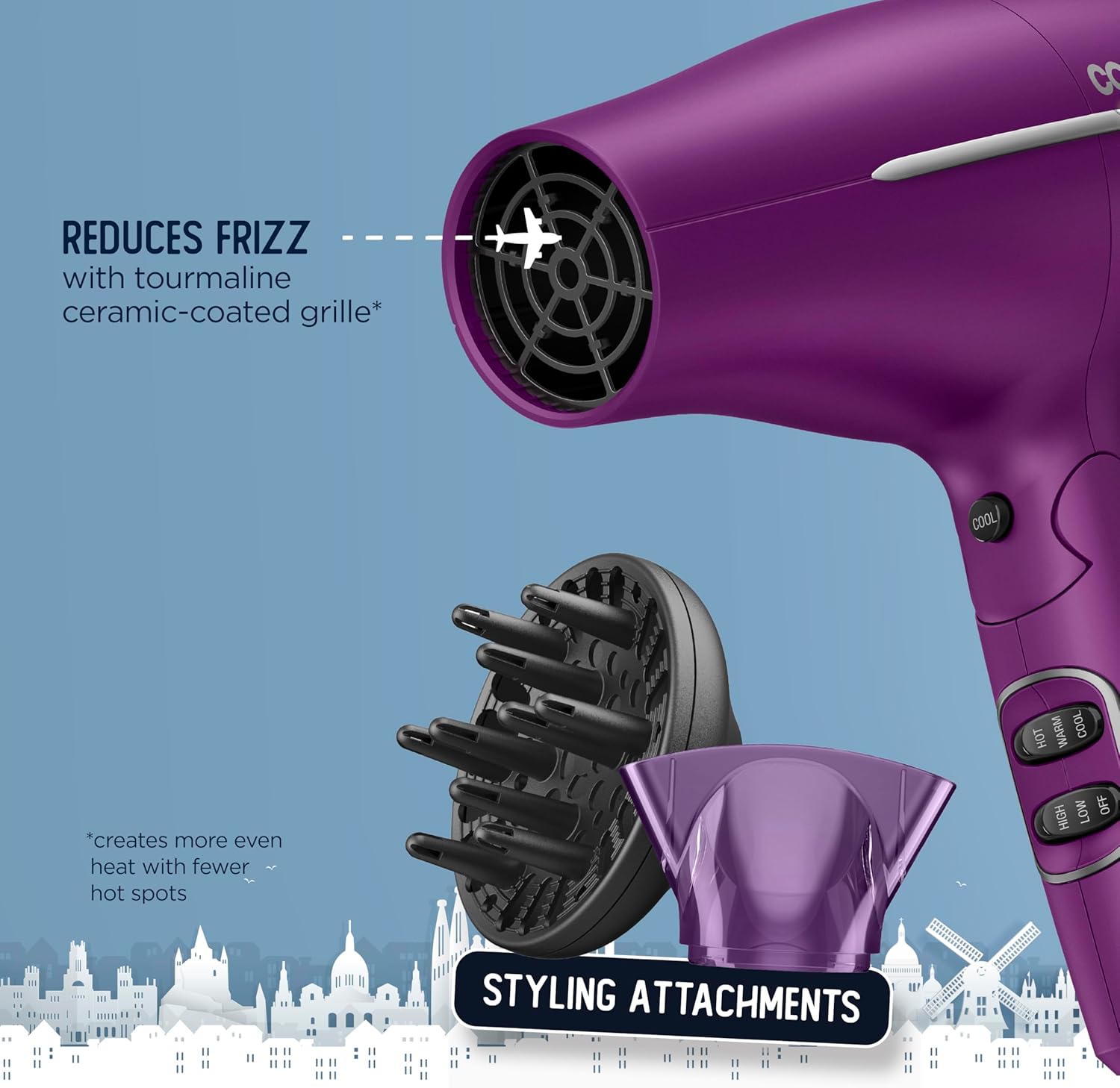 Conair Hair Dryer, Worldwide Travel Hair Dryer with Smart Voltage Technology and Folding Handle, Includes Diffuser and Concentrator, Purple