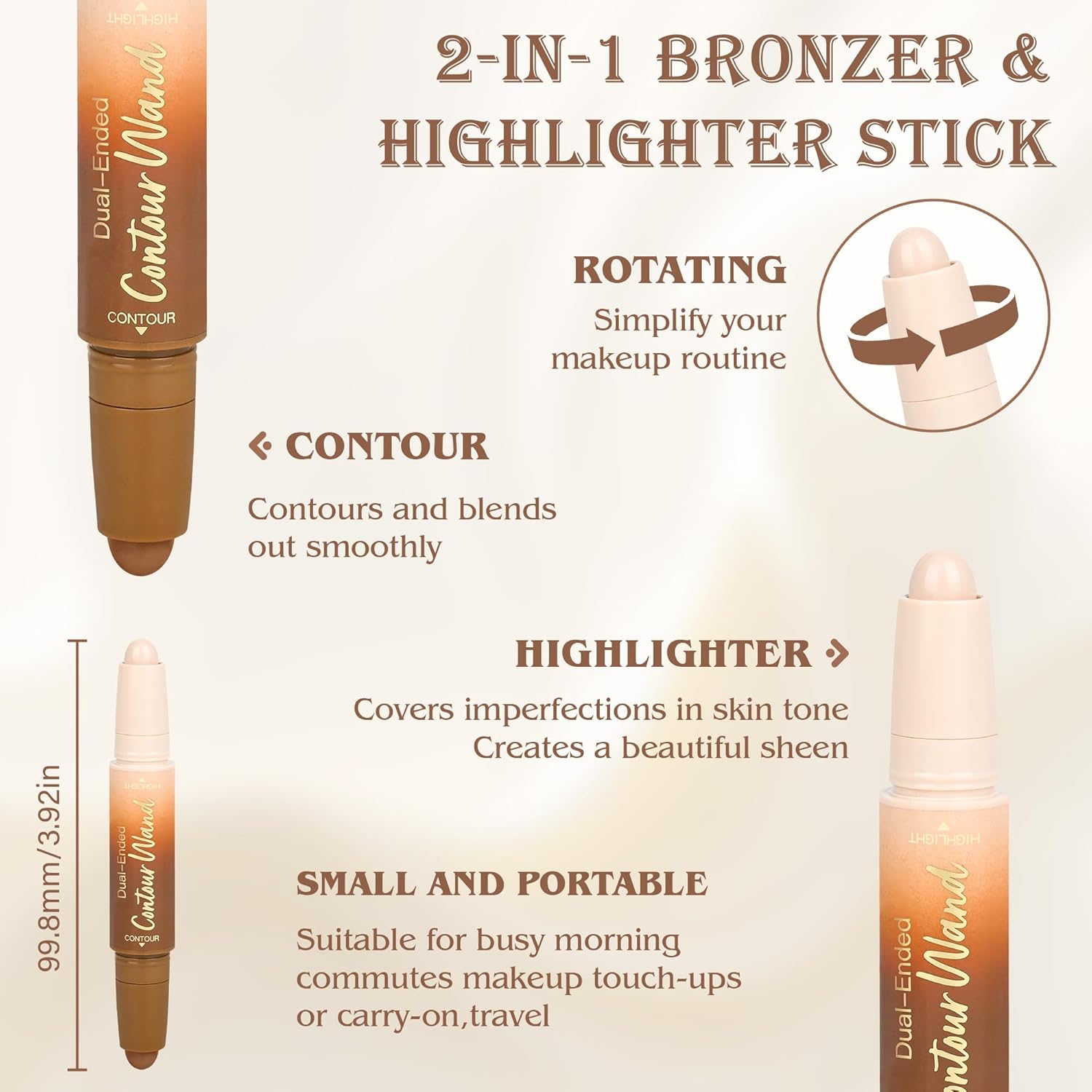 2-in-1 Contour Highlighter Stick: This dual-ended stick allows for precise application. One end is a creamy contour stick for contouring and creating natural shadows, while the other end is a highlighter (matte or shimmery) for adding radiance. This conveniently simplifies your makeup routine and eliminates the need to carry multiple products.