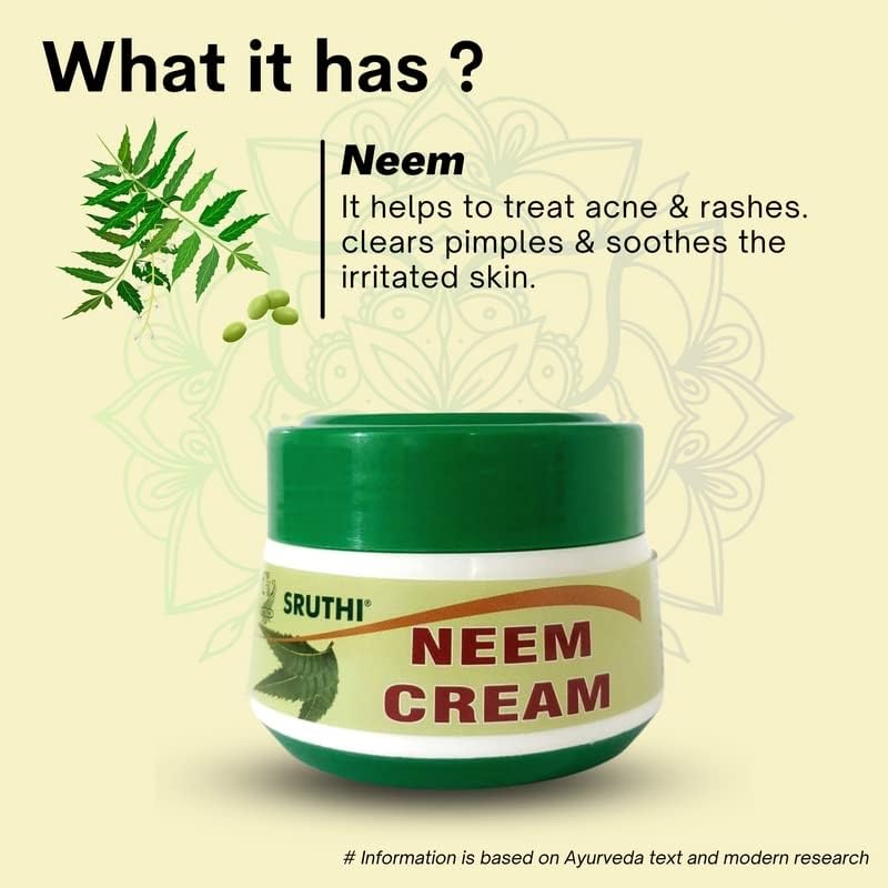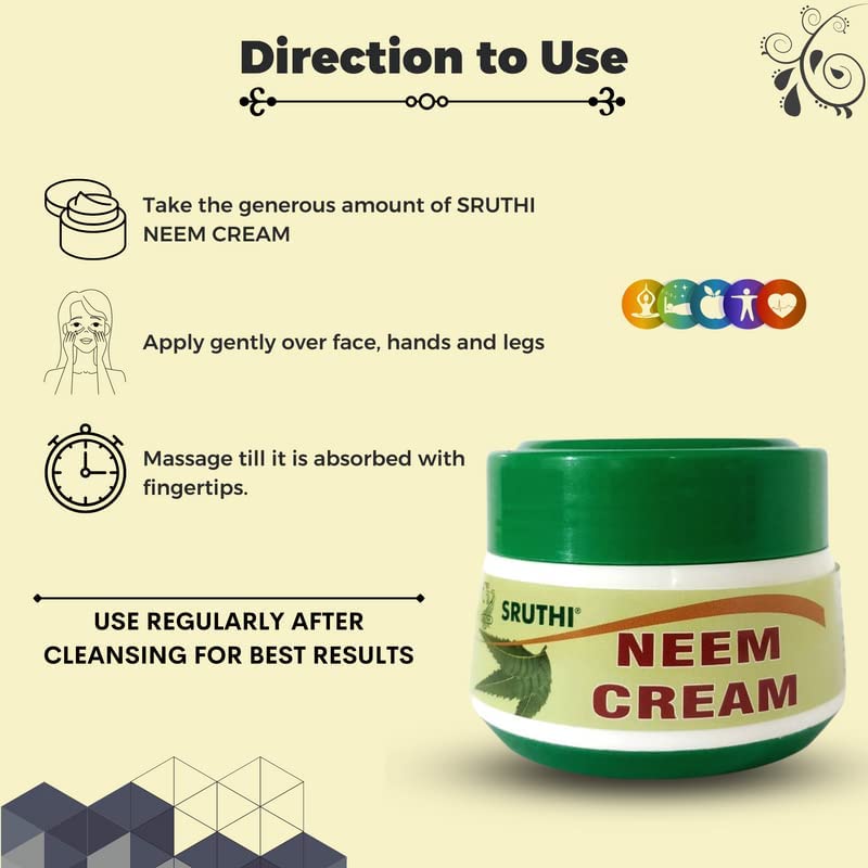 Direction to use: Apply Sruthi Neem Cream gently over face, neck, hands and legs daily after cleansing. For best results use daily.