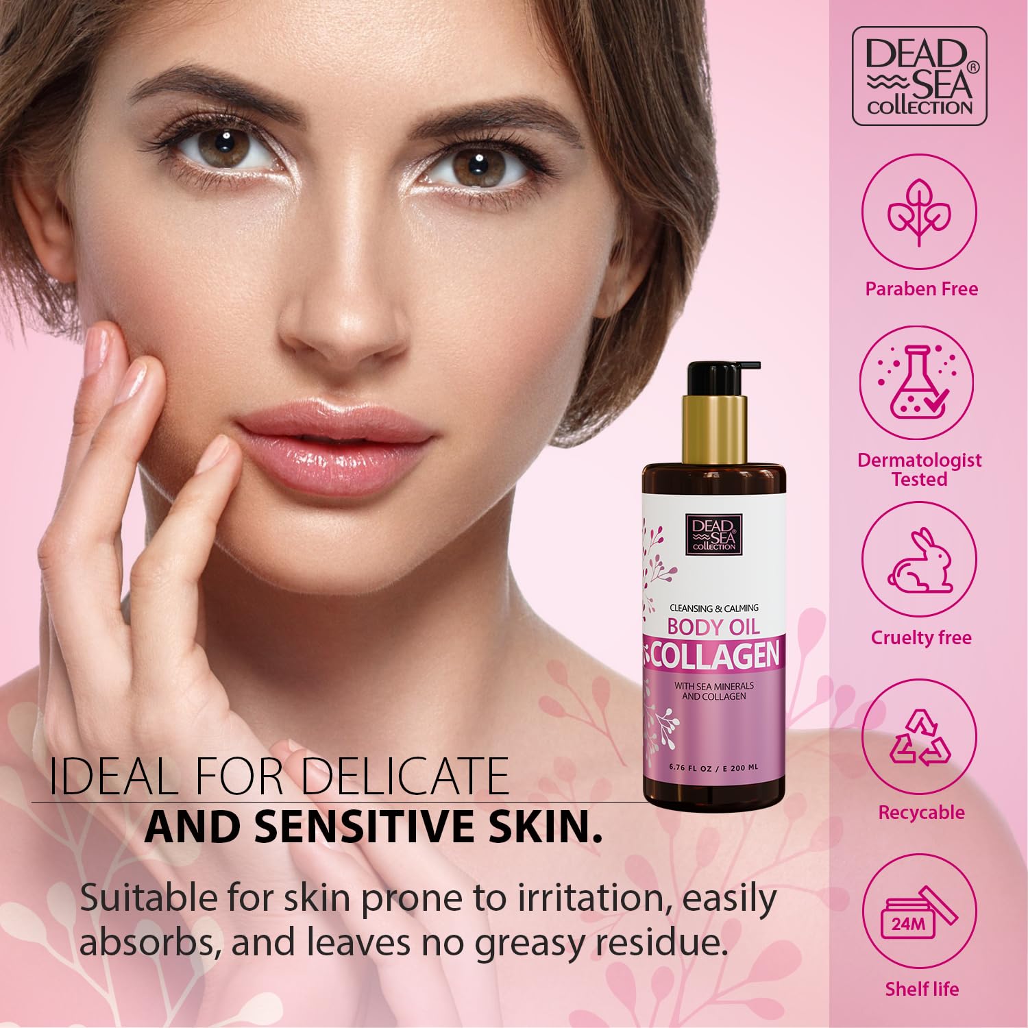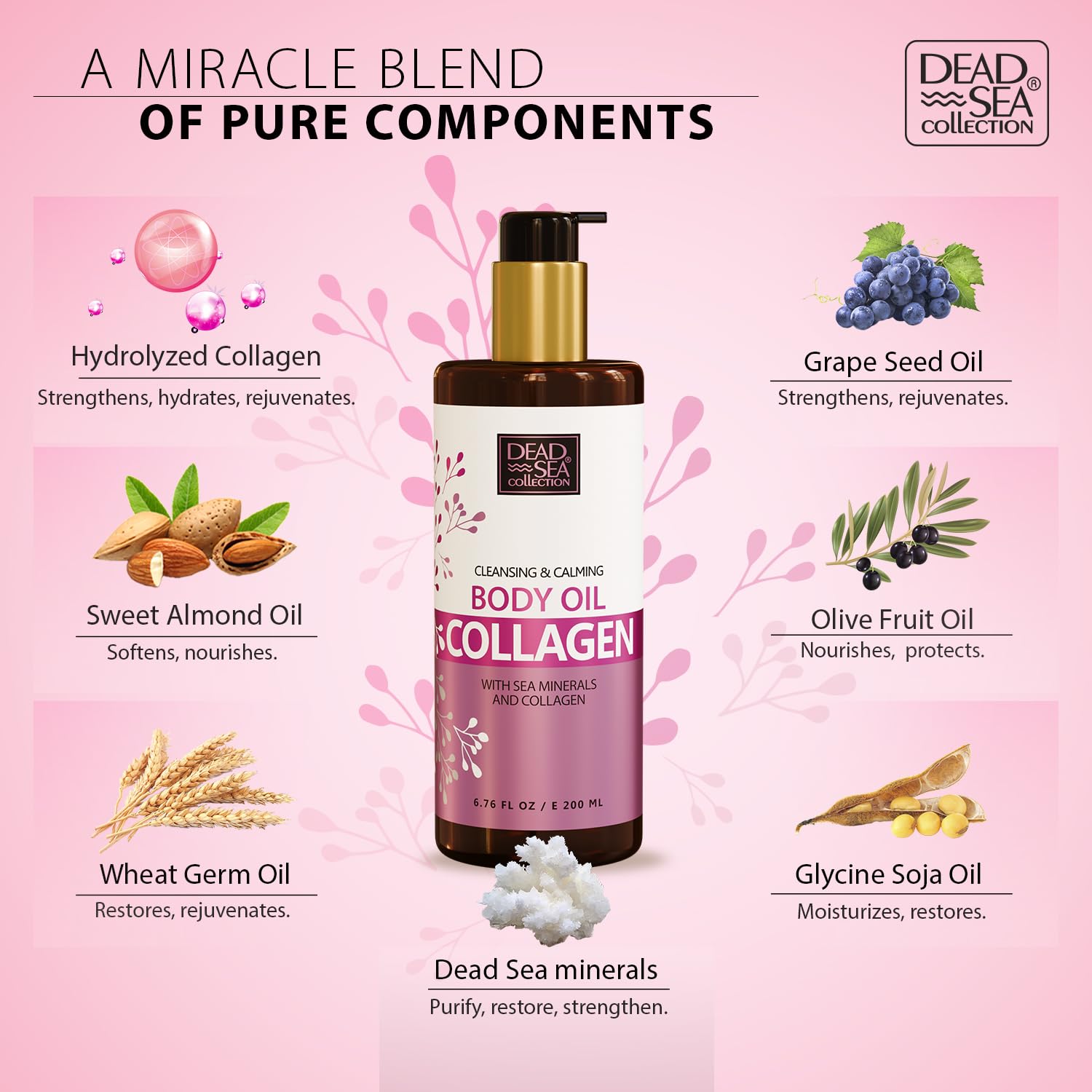 Dead Sea Collection Collagen Body Oil for Dry Skin – Moisturizing & Hydrating Skin Oil with Vitamin E and Blend of Almond, Grape, Olive, Wheat Germ Oil – Soothing & Nourishing Skin Care – 6.76 oz