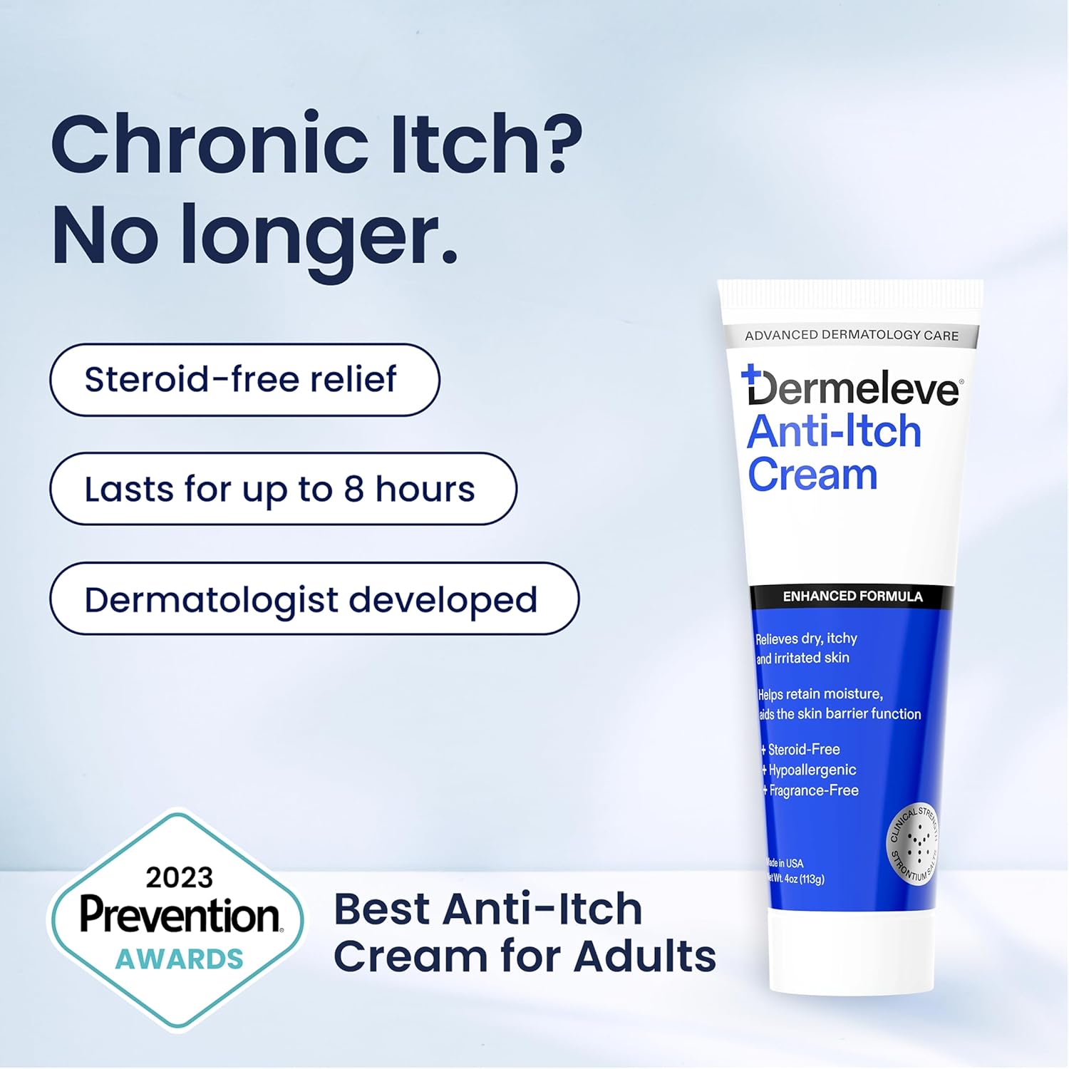 STEROID-FREE ANTI-ITCH CREAM: Dermeleve is a next-generation OTC itchy skin relief cream formulated specifically to deliver safe, maximum strength results—even for sensitive body parts, intimate areas, and thinning skin. Suitable for all unbroken skin, it provides effective, fast itch relief.