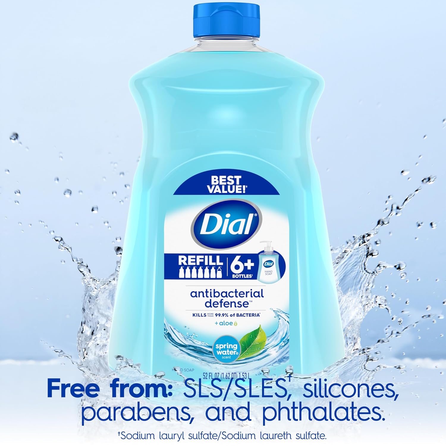 Dial Antibacterial Liquid Hand Soap Dial up your clean and enjoy the fresh scent of Dial Antibacterial Defense Spring Water liquid hand soap. This pH-balanced, dermatologist-tested formula is tough on bacteria, yet gentle on skin. It kills more than 99.99% of bacteria encountered in household settings*—including common kitchen bacteria* while cleansing deeply and removing dirt, impurities & residue. Made with moisturizers, aloe vera and gentle cleansers, it leaves skin feeling soft, smooth, and clean with every wash. Suitable for kitchens, bathrooms, or workplace sinks, it delivers a luxurious lather with each pump. Formulated without SLS/SLES†, parabens, silicones, and phthalates, this vegan formula hand soap combines freshness with functionality. Packaged in a recyclable bottle (cap excluded). Choose from a range of delightful fragrances and know that you can trust this liquid soap to keep your hands clean. The #1 doctor-recommended antibacterial brand** delivering clean confidence for generations. Dial is committed to providing formulas that care for skin without compromise—thoughtfully crafted, and approved as cruelty free under the Leaping Bunny program. Gentle, reliable cleansing for every hand in your home. *Encountered in household settings.*Escherichia coli, Salmonella, Listeria, Shigella and Camplyobacter **Antibacterial hand soap brand †Sodium lauryl sulfate/Sodium laureth sulfate