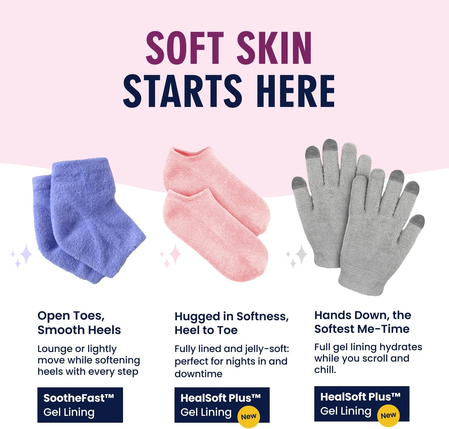 Wrap Your Feet in All-Day Comfort: Our wraparound HealSoft Plus gel lining hydrates your entire foot from forefoot to heel with our new moisturizing formula: mango butter, shea butter, jojoba oil, and coconut oil, plus calming essential oils. It’s full-foot therapy in your favorite fuzzy socks.