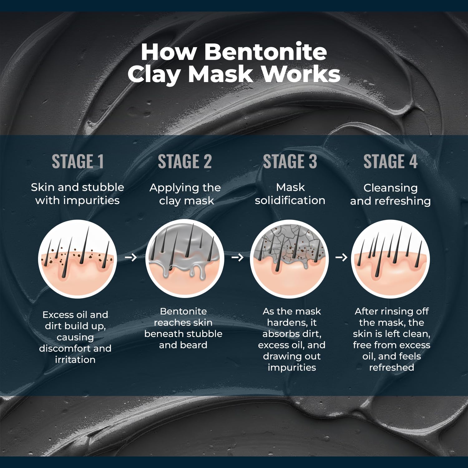 Dual-Action Men’s Clay Mask – Formulated with bentonite and volcanic soil to deeply cleanse skin on the face and under the beard, removing excess oil, buildup, and impurities.