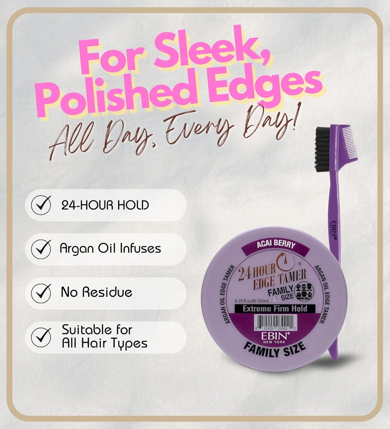 𝗘𝗗𝗚𝗘 𝗦𝗧𝗬𝗟𝗜𝗡𝗚 𝗦𝗘𝗧 – This gift set includes 1x 24 Hour Argan Oil Edge Tamer Refresh 8.25 oz (Acai Berry) and 1x 3-in-1 Brush & Comb, designed to hydrate, smooth, and secure your edges for a long-lasting, sleek look. (Packaging May Vary)