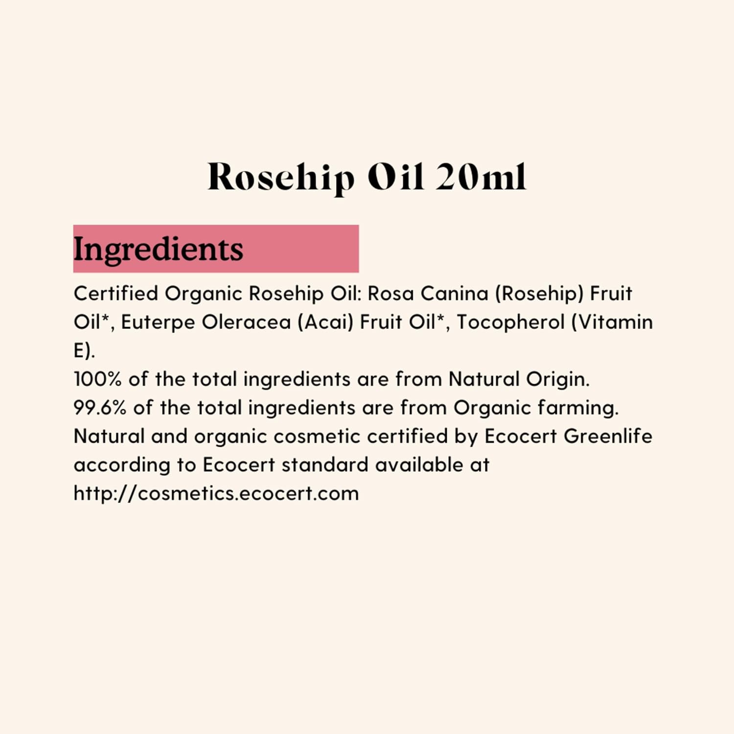 Rosa Canina (Rosehip) Fruit Oil*, Euterpe Oleracea (Acai) Pulp Oil*, Tocopheryl Acetate (Vitamin E)