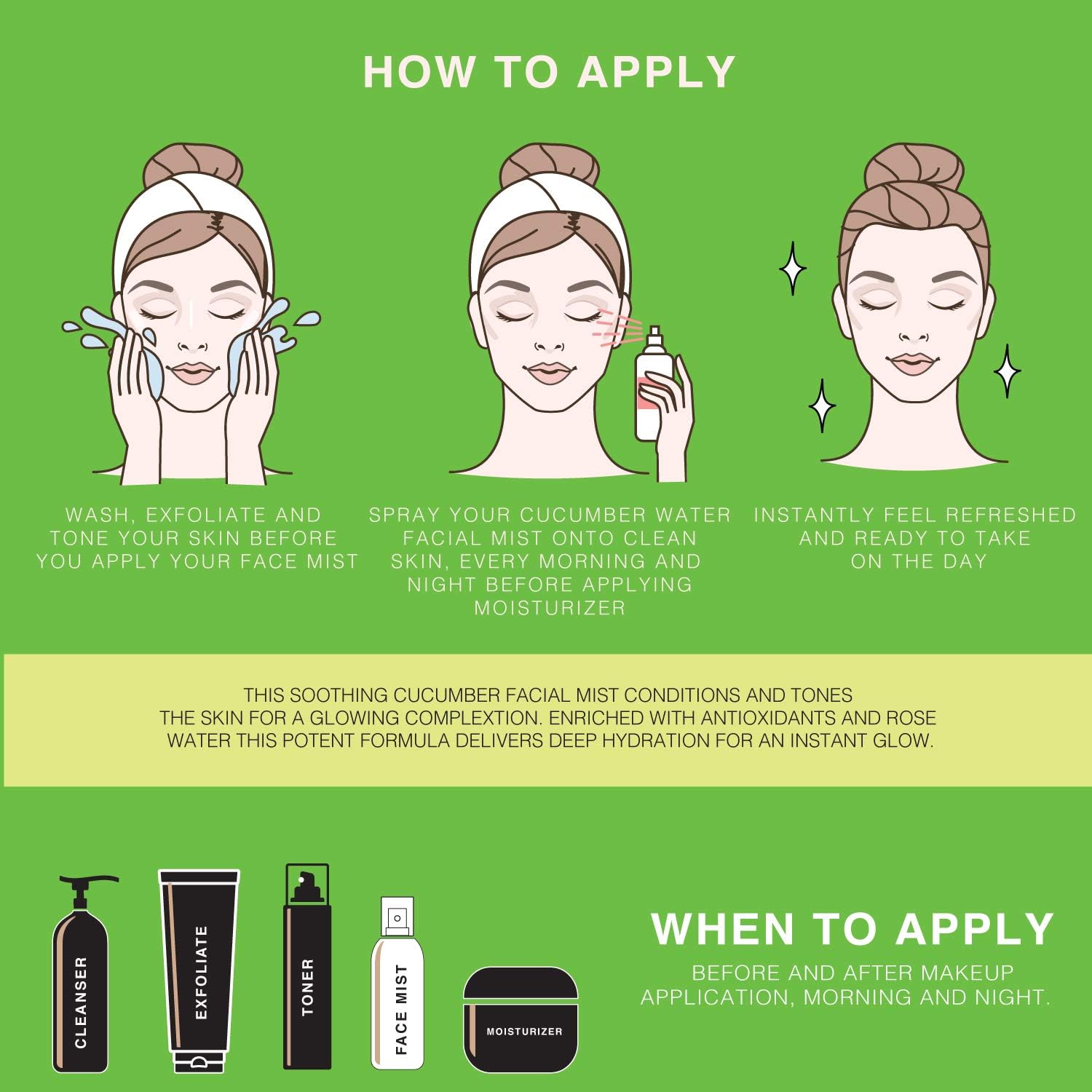 Soothing cucumber water mist conditions and tones for a glowing complexion enriched with antioxidants and rose water to minimize pores and provide instant burst or radiance