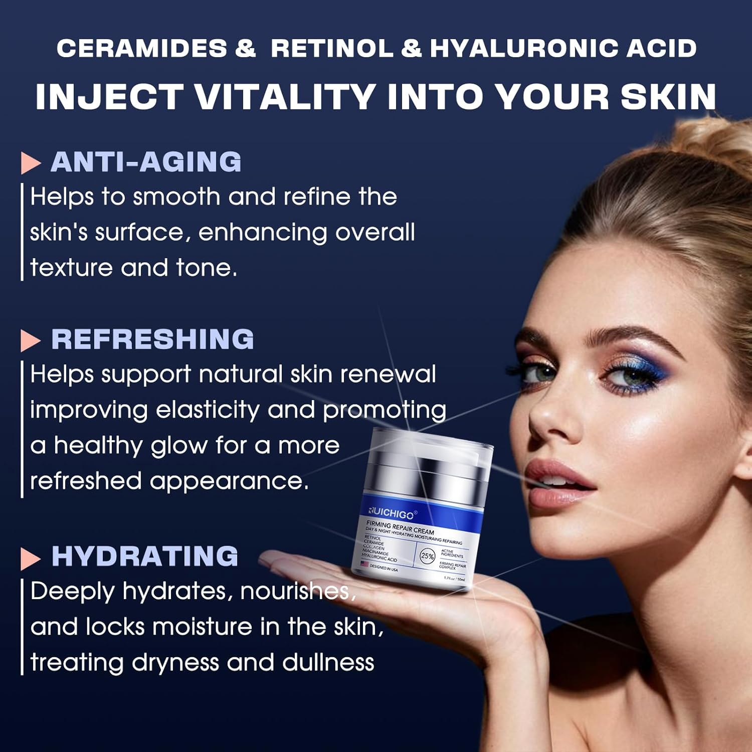 Five key actives—Retinol, Collagen, Hyaluronic Acid, Niacinamide, Ceramide—help improve appearance of lift, firmness, hydration. Improves elasticity look, smooths texture, maintains moisture without unwanted additives. Suitable for daily use.