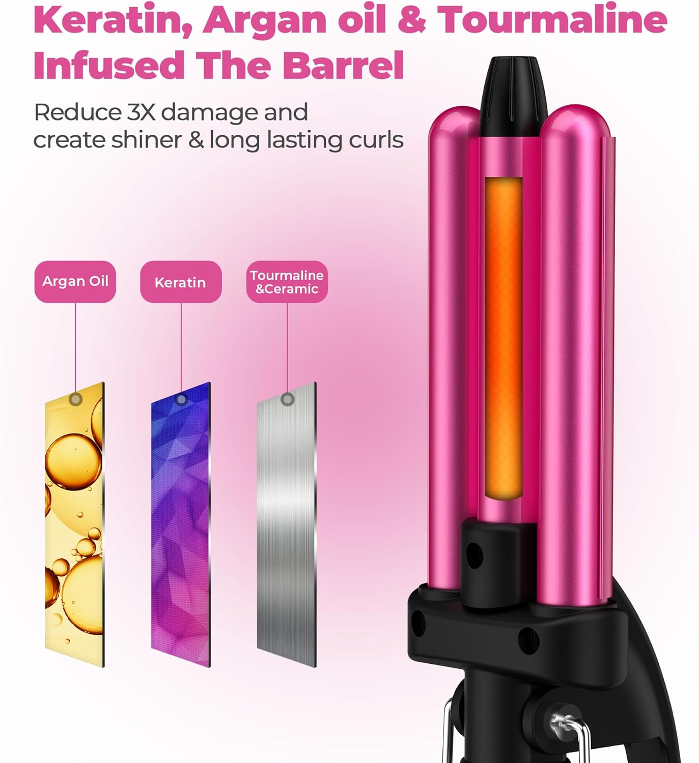 Shiny Waves, Less Damage:Infused with keratin, argan oil & tourmaline to release negative ions for shine. Even heat from ceramic plates reduces 3x heat damage for lasting smooth waves.