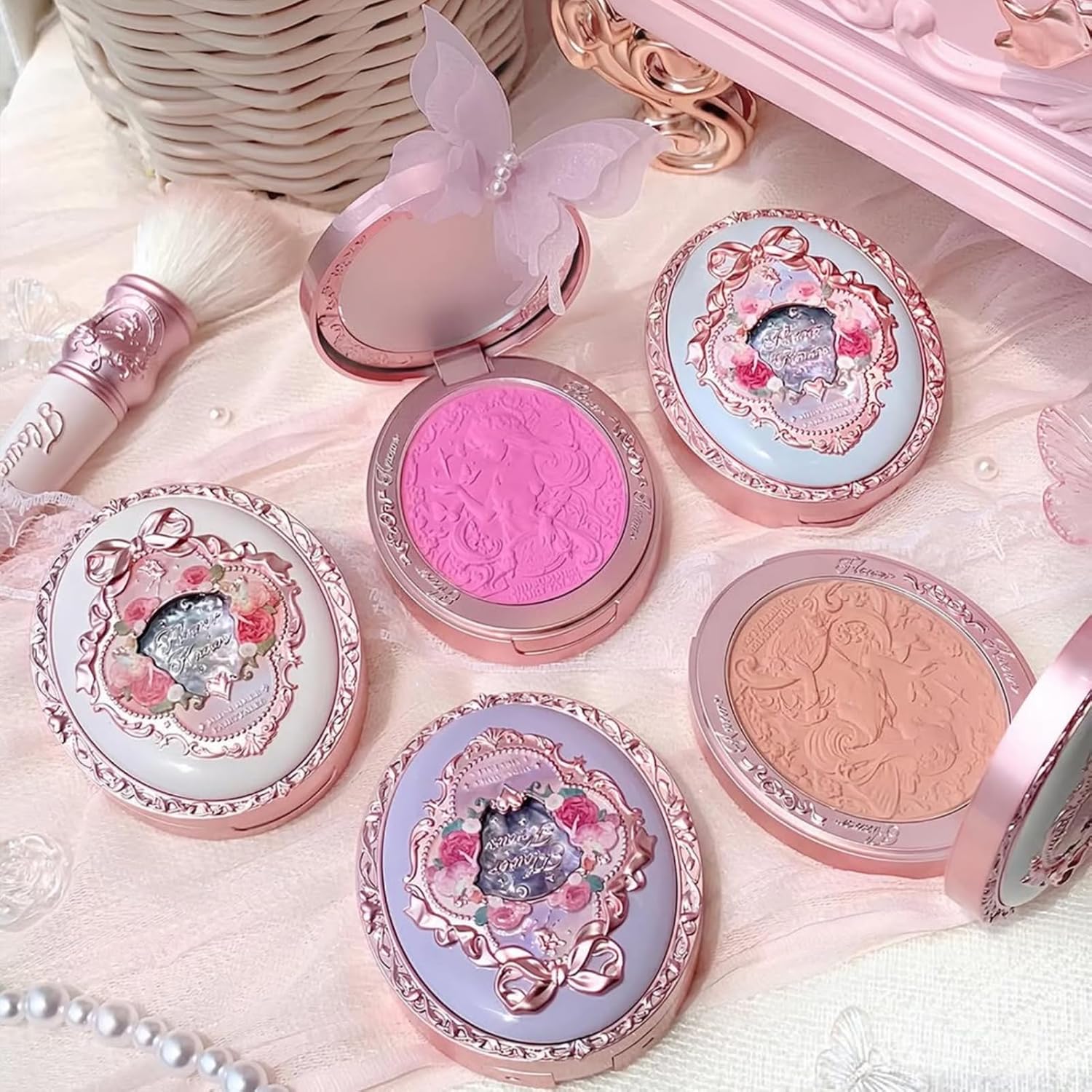 Exquisite Collectible Design with Embossed Detail: Features a beautifully intricate 3D fairy and floral embossed pattern,encased in a stunning,inspired by antique brooches with delicate floral borders and bows.This blush doubles as an elegant decorative piece, making it perfect for gifting or display on any vanity