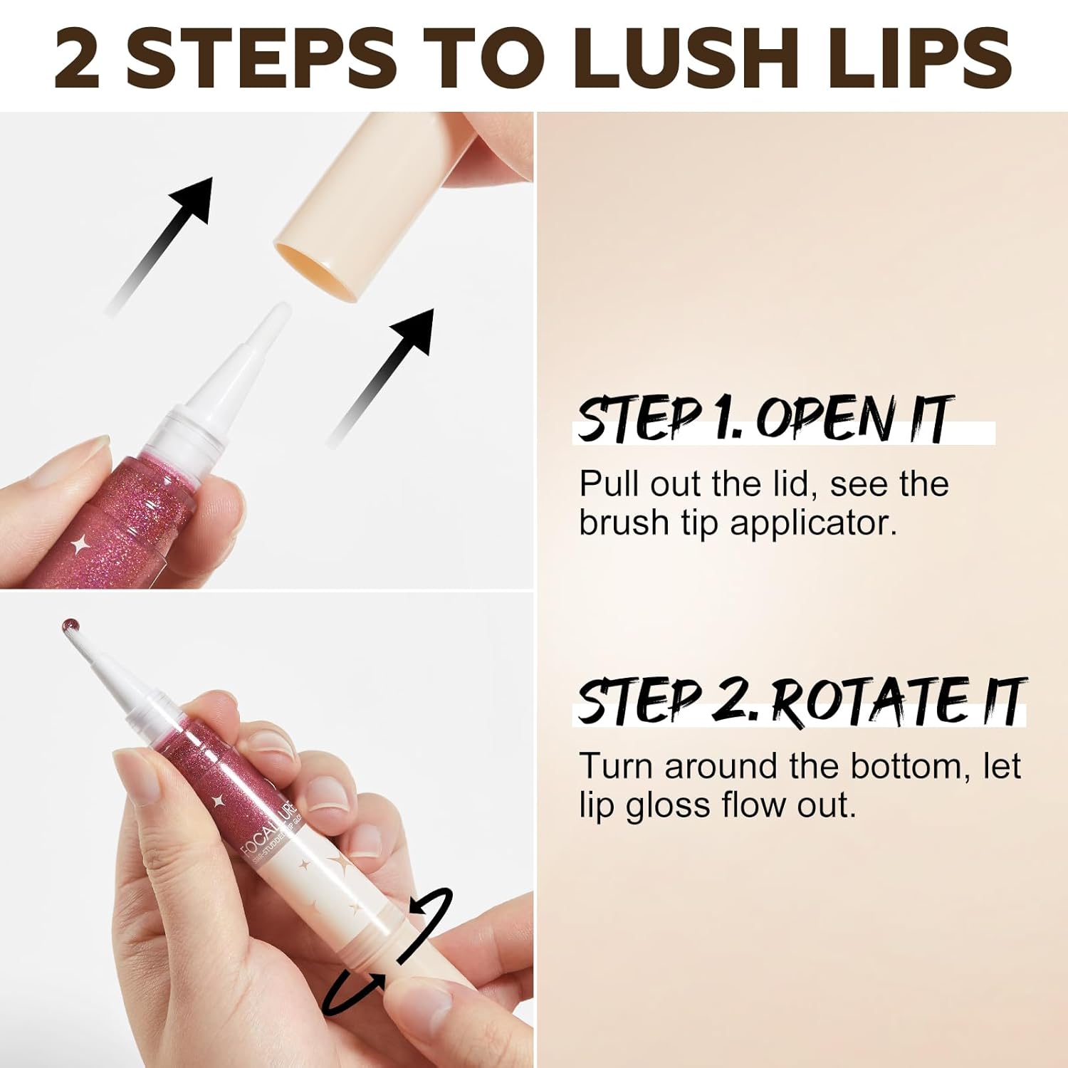 【Glossy Shimmery Finish】Formulated with tinted glaze and different colors of glitter, luminous effects shift in different angle.The glow lip gloss plumping your lips with a shimmery, sheer finish.