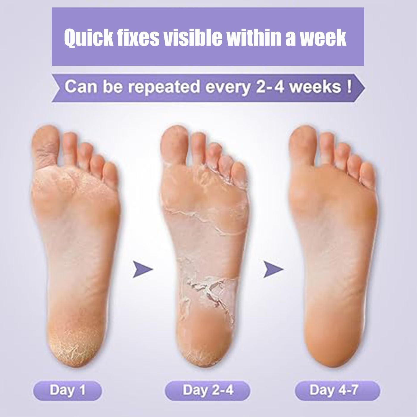 【User-friendly Design】Easy to wear, easy to tear, use it at any time for maintenance and leisure. You can use scissors to split them in two, or you can tear them by hand. Exfoliating foot peeling mask provides a treatment to remove hardened, dead,callused skin to make your foot skin soft and tender like baby in 1-2 weeks