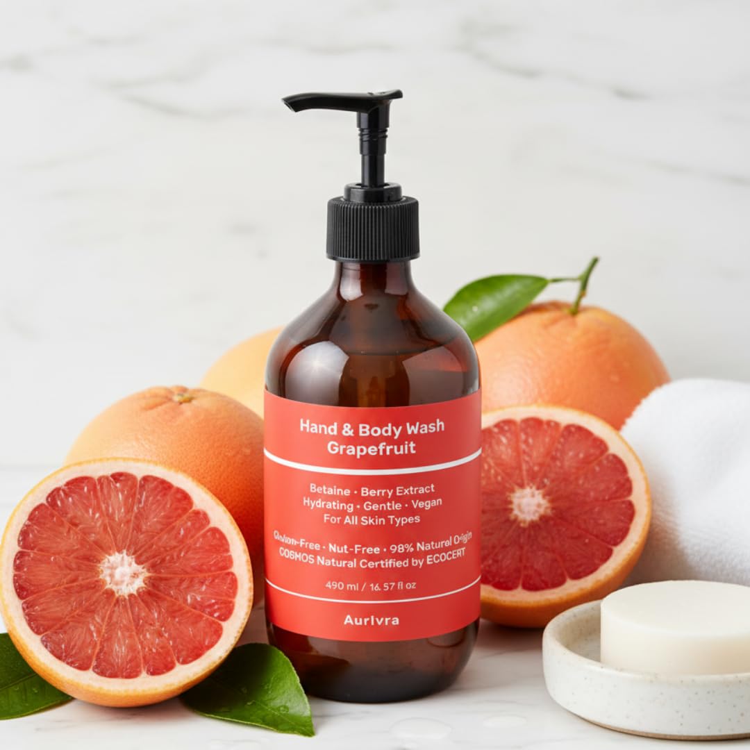 Refresh and revive your skin with our Grapefruit Hand & Body Wash, a gentle, moisture-locking cleanser crafted for daily use on all skin types. This hydrating formula blends naturally derived surfactants with skin-softening Betaine and antioxidant-rich Berry Extract to cleanse without stripping essential moisture. The invigorating zesty grapefruit aroma energizes your senses while leaving your skin feeling soft, smooth, and delicately refreshed. Made with 98% natural-origin ingredients, this vegan, gluten-free, and nut-free body wash is ECOCERT COSMOS Natural Certified, ensuring it’s produced responsibly using eco-friendly methods, recyclable packaging, and zero GMOs. Perfect for cleansing, hydrating, and refreshing dehydrated or dull skin.