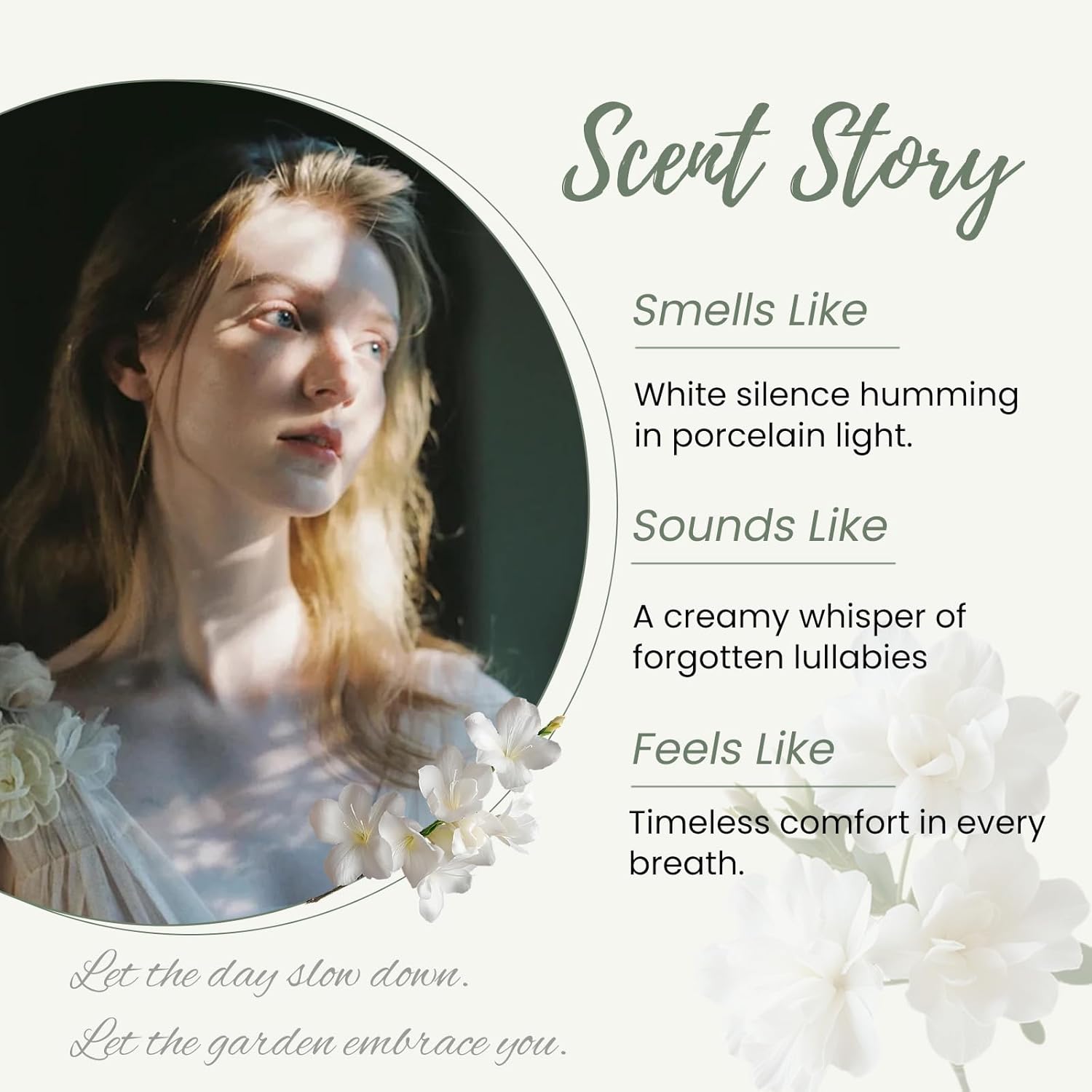 SIGNATURE SCENT: Indulge in the perfect harmony of nature’s finest notes, soothing chamomile, velvety milk essence, and sweet jasmine petals. This unique heavy cream perfume leaves you pampered and confident all day.