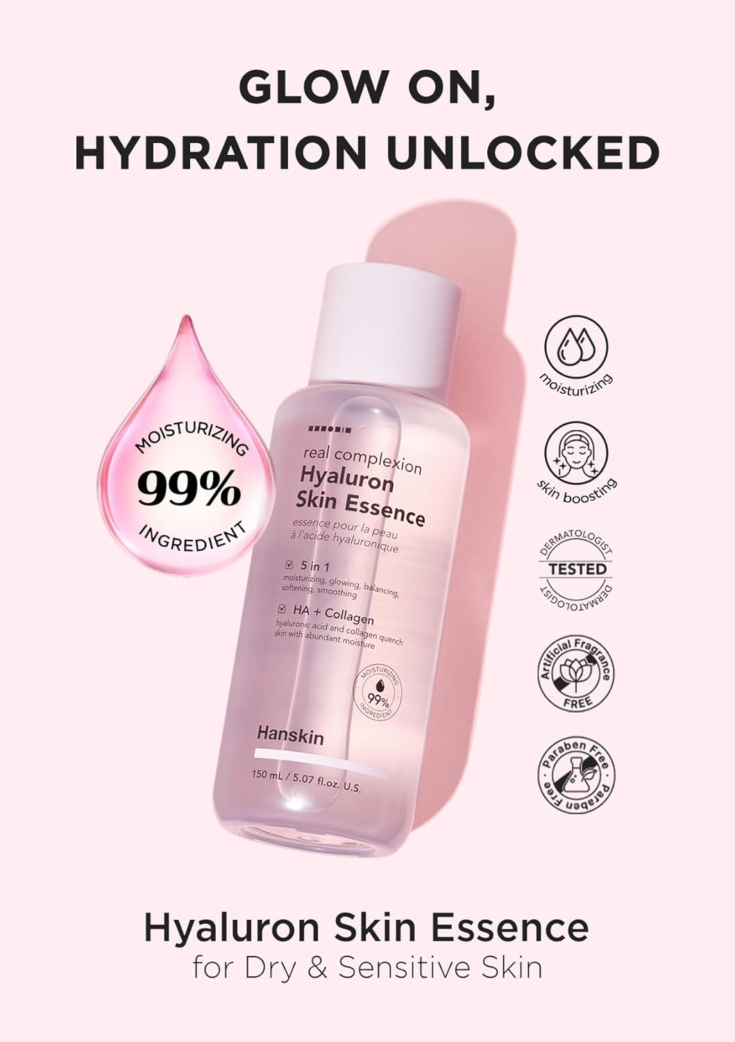 Hanskin Real Complexion Hyaluronic Skin Essence, Hydrating Toner for Dry, Dull, Sensitive Skin – Hyaluronic Acid Collagen Moisturizing Purifying Paraben-Free Korean Skincare for Face [5.07 fl. oz.]