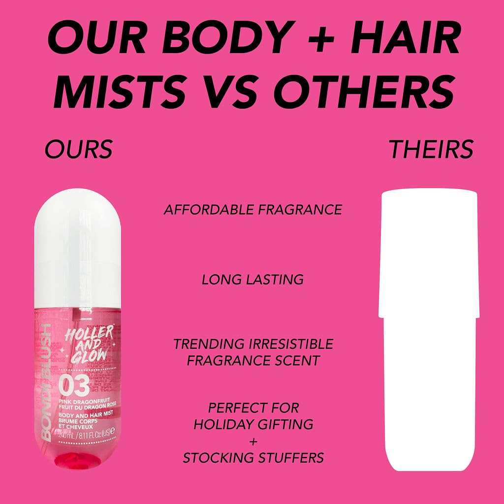 Transport yourself to a tropical oasis with the sweet, alluring scent of our Bondi Blush Body and Hair Mist. Infused with notes of exotic pink dragon fruit, delicate floral jasmine, and warming amber, this dreamy fragrance captures the vibrant essence of Bondi Beach. Perfect for an all-day refresh, this lightweight mist keeps you feeling fresh and radiant while evoking endless summer vibes. Bondi babe ready! Holler And Glow is a female-founded innovation obsessed brand, tapping into TikTok generated trends and other social media must haves. We offer a range of skin care accessories, perfect for women and girls looking for a spa day.